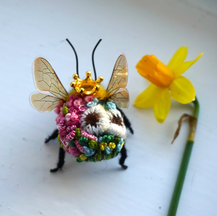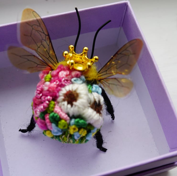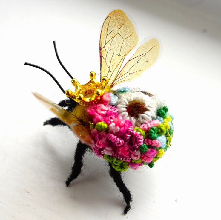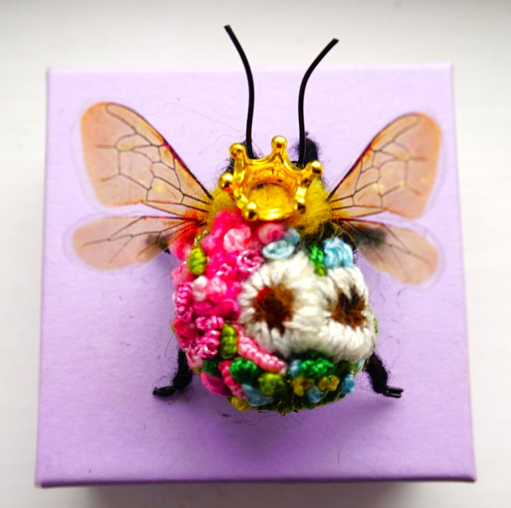 Needle felted and embroidered queenr bee, measures approx 3 cm long by 5cm wide .She has a little crown attached to her head.Your bee will come with a fine gold hanging thread ,which can be snipped off if not required,Gift box included.This is actual bee you can purchase.