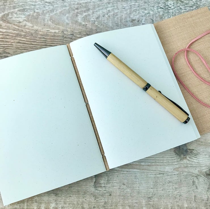 80 pages (160 sides) of high quality 120gsm recycled paper are folded into four sections, then stitched into the cork fabric. The paper is suitable for all writing and drawing mediums. The journal is tied with a soft pink faux suede cord.