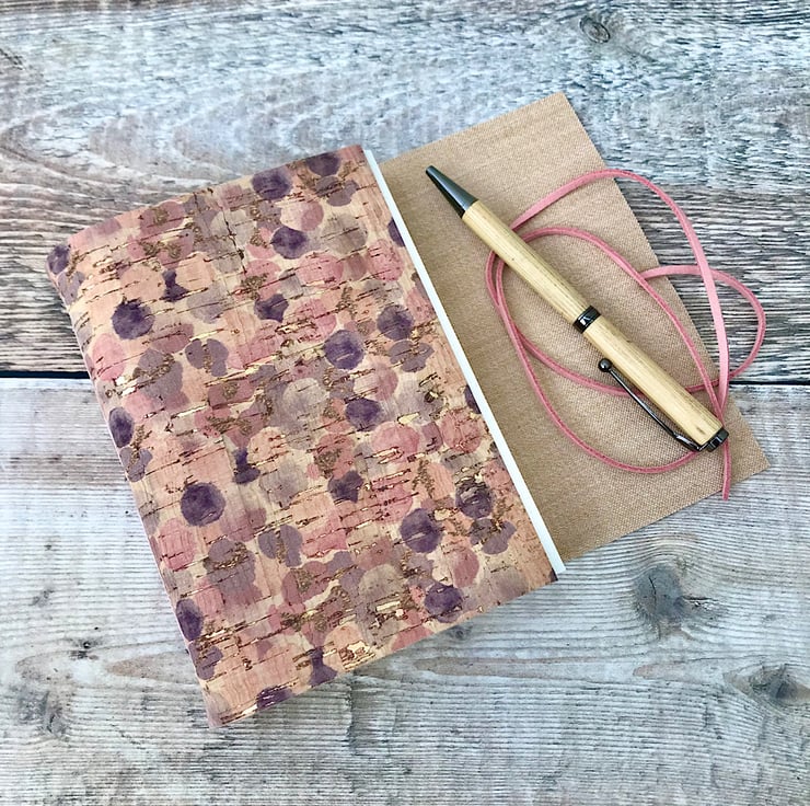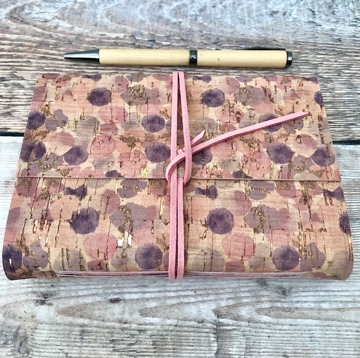 This A6 cork journal notebook is made with sustainably harvested cork which has a pretty pink and purple bubbles print.