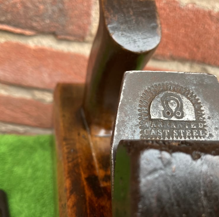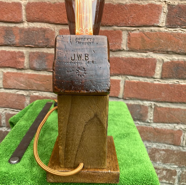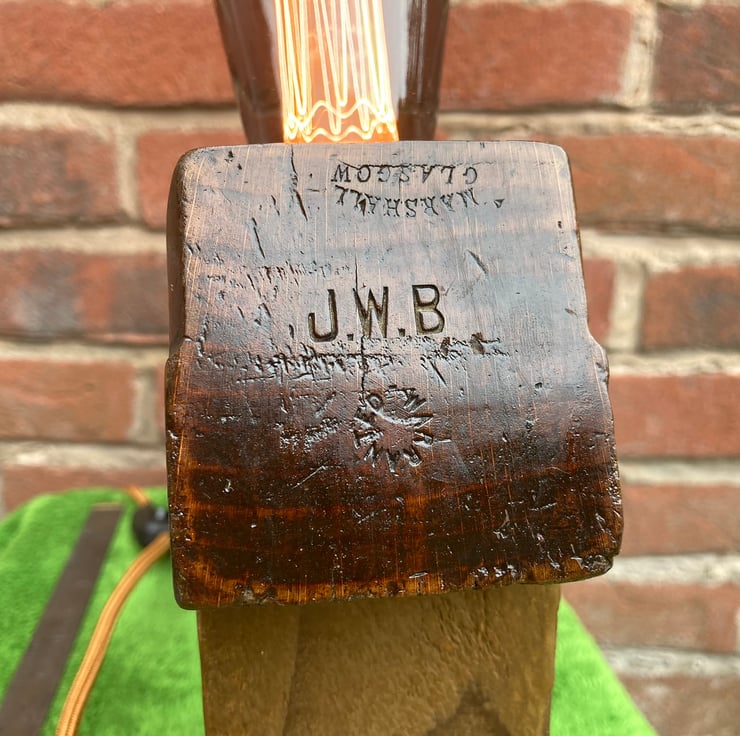A beautiful wooden table lamp, made from a quality antique jack plane from the late Victorian period, 1880 -90s, with the maker’s mark ‘Marshall Glasgow’ (Alex Marshall of Glasgow) and ‘Warranted’ on the toe end. It also bears the initials ‘JWB’ of a proud previous owner stamped neatly into both ends though, inevitably for a working tool, shows its age through knocks and dents about the body and a chip from the top of the handle.