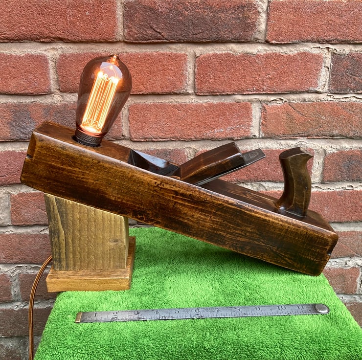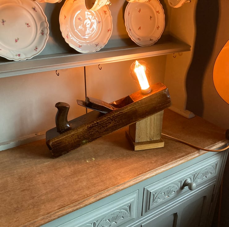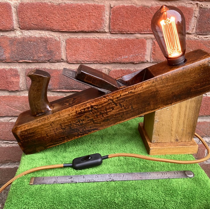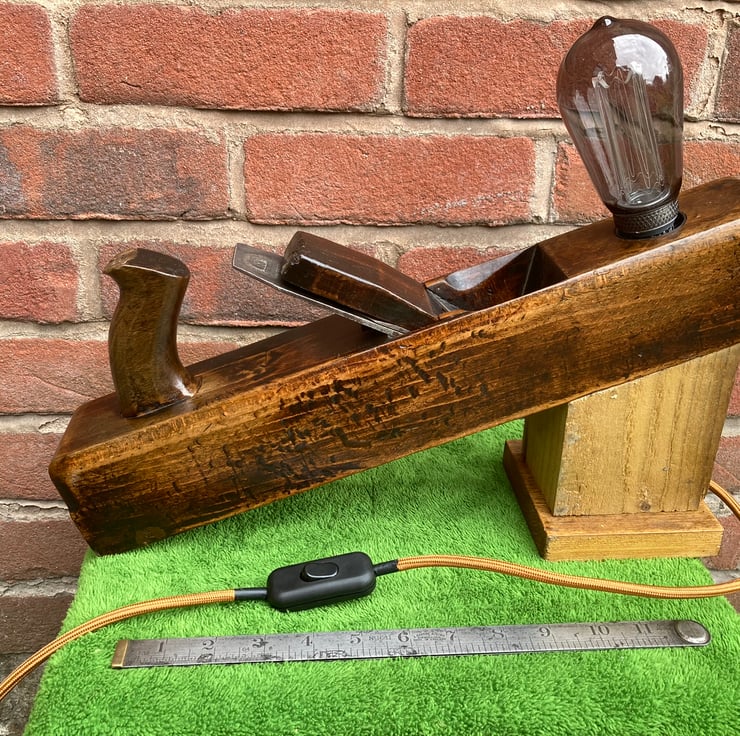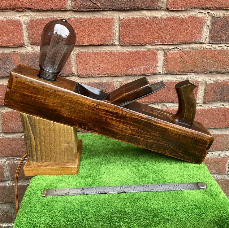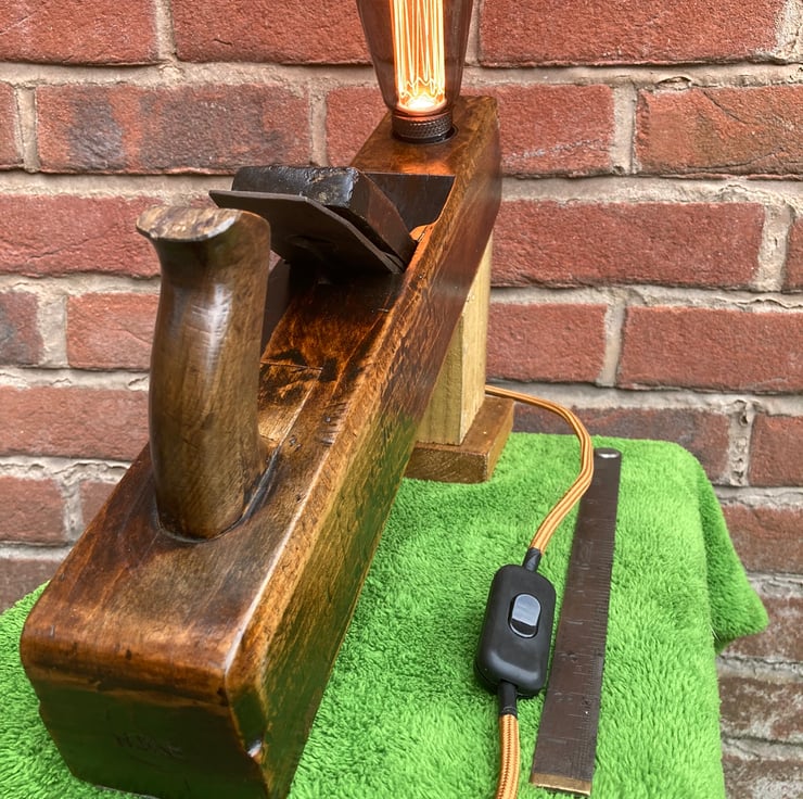 I have lightly sanded the beech wood and given it a few coats of French polish, which has really added a shine and brought out the beauty of the wood and patina, mounted an Edison Screw (E27) lampholder in the toe end and made a stand which holds the plane at a jaunty angle – and keeps fingers away from the blade. The stand is made from reclaimed timber and has deliberately been left rough surfaced to give the idea of the plane working it.