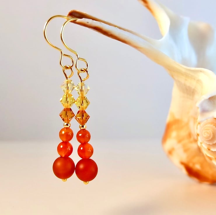 Each of these cheerful earrings features a 6mm, burnt orange, frosted Carnelian, two 4mm natural Carnelian, a tiny gold vermeil bead, and a trio of Swarovski crystals for sparkle.