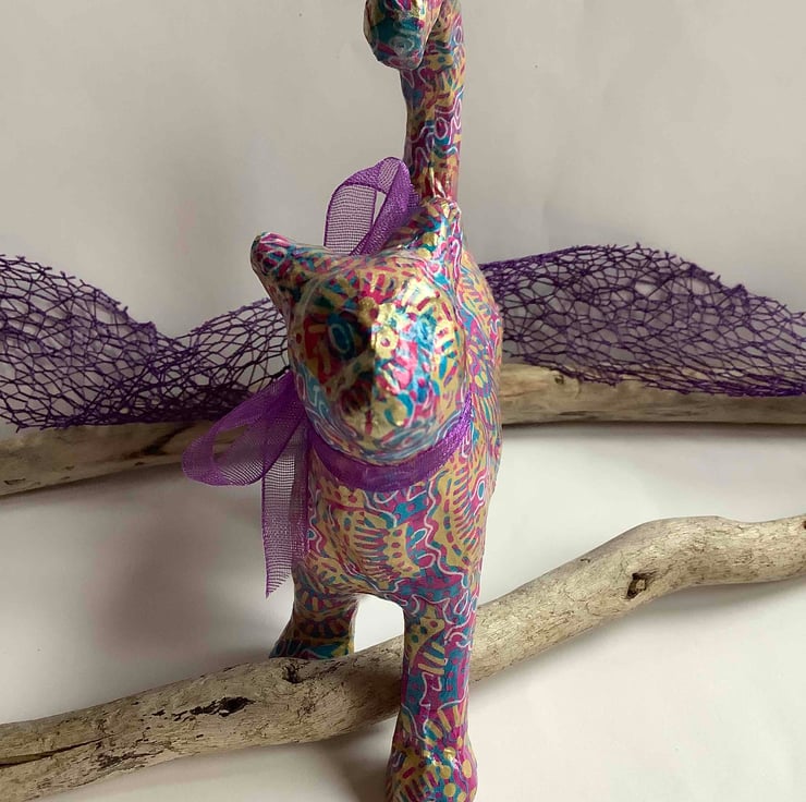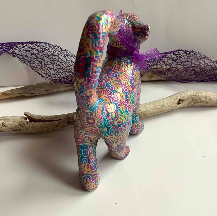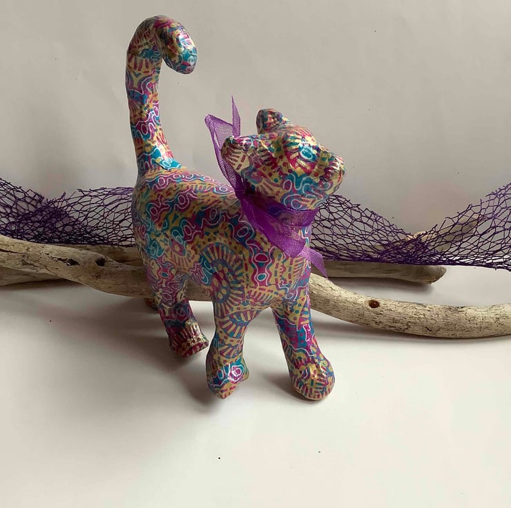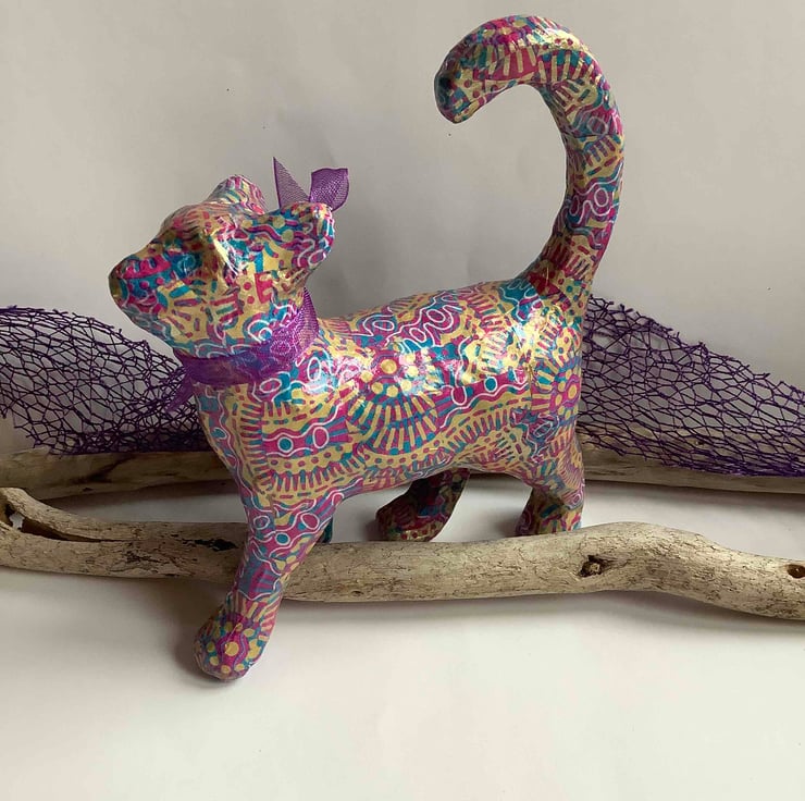 This papier mache cat is decorated in patterned papers and then is finally varnished.