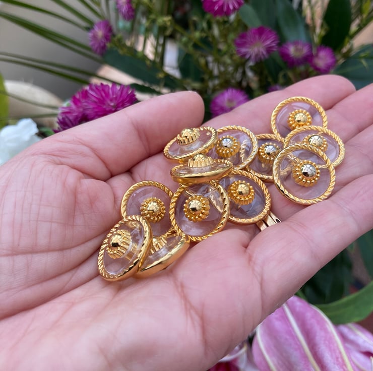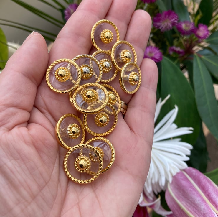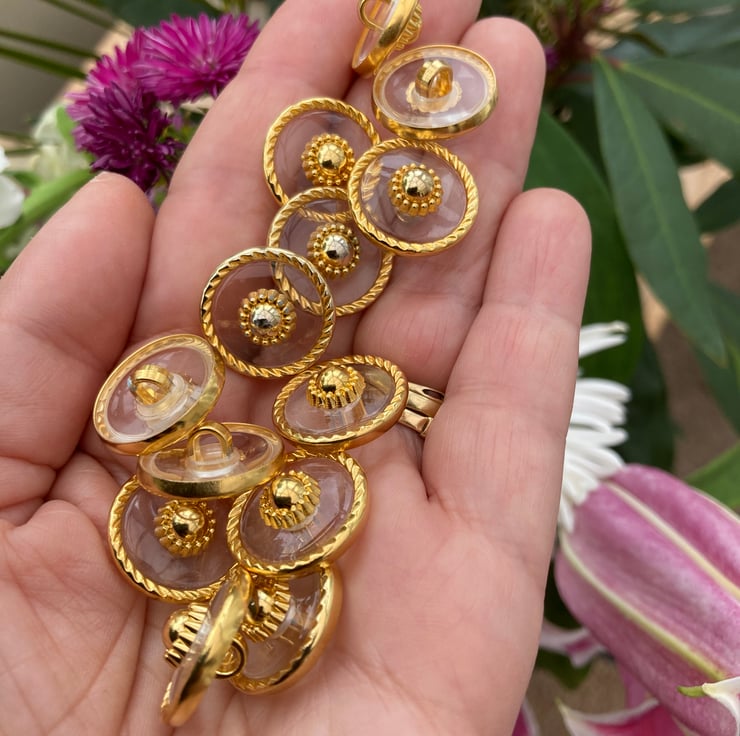 A set of 13 gold-tone and clear lucite vintage buttons that have a central raised metallic hub and coiled rope like edging, the back has a loop shank. They look to me very much like shields and the design catches the light beautifully and are flat at the back.