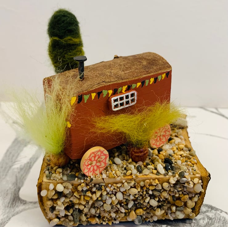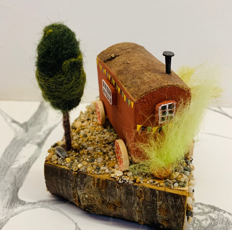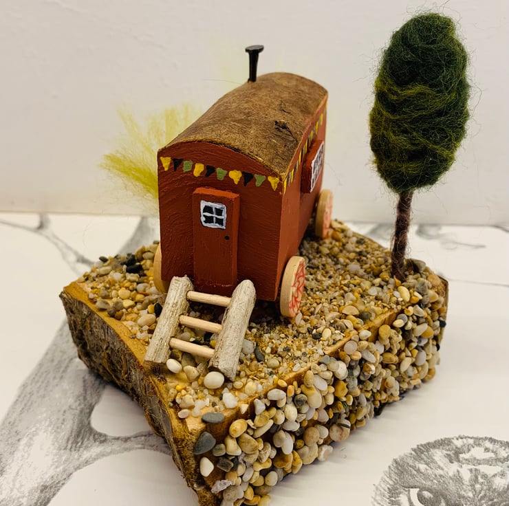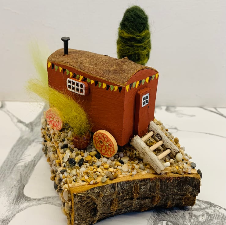 A tiny shepherds hut with its own steps, button wheels, needle felted tree, and two pots of plants set on a gravelled log.