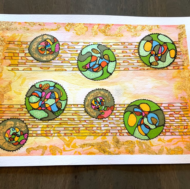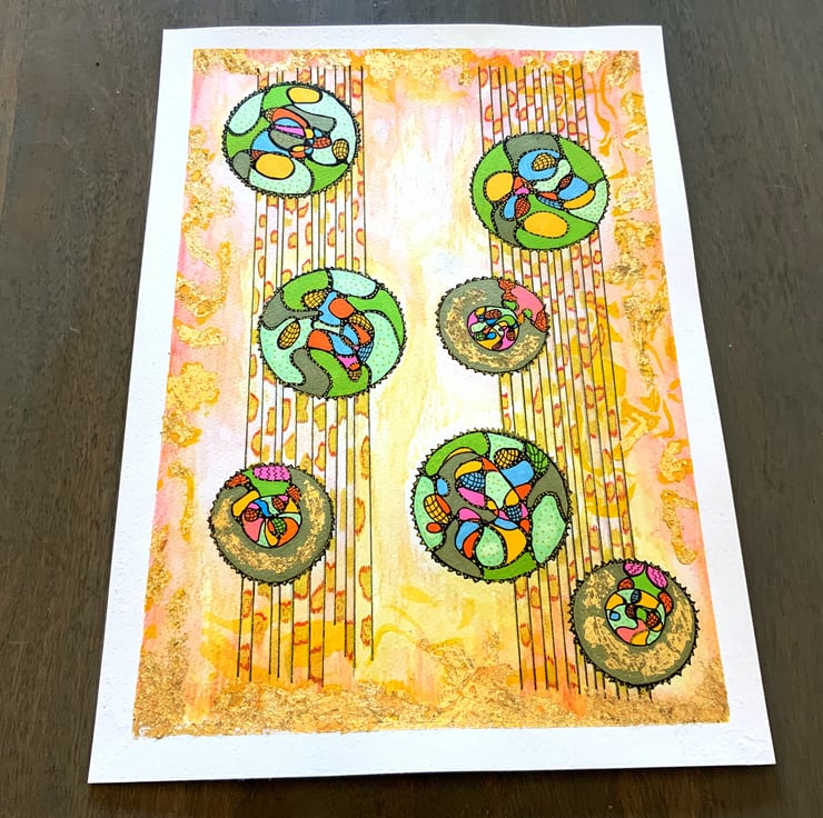 Gold leaf has been laid to frame the area and has been added to the smaller circles.