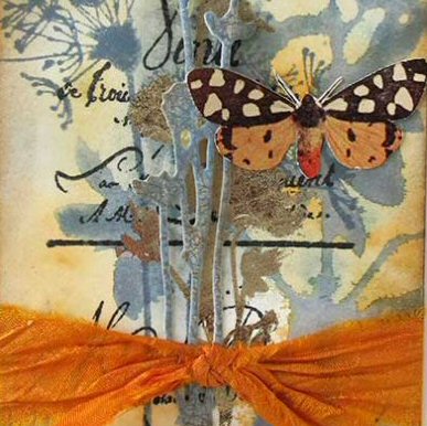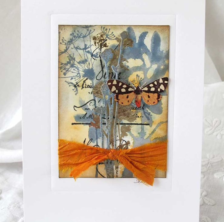 I draw inspiration for my art from my love of nature and the countryside. I enjoy using lots of different mediums to create my work, and often include found objects that I've collected over the years. For this card I have also used some Tim Holtz dies and stamps.