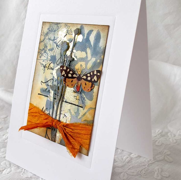 A beautiful and unusual hand made card. This unique card has been hand stamped and inked, with foil accents, die cut foliage and finished with a piece of coordinating sari silk. Some foliage has been mounted to give a slightly 3D effect. The panel has been mounted on good quality card with a lightly embossed frame around it. The card has been left blank so it can be used for any occasion.