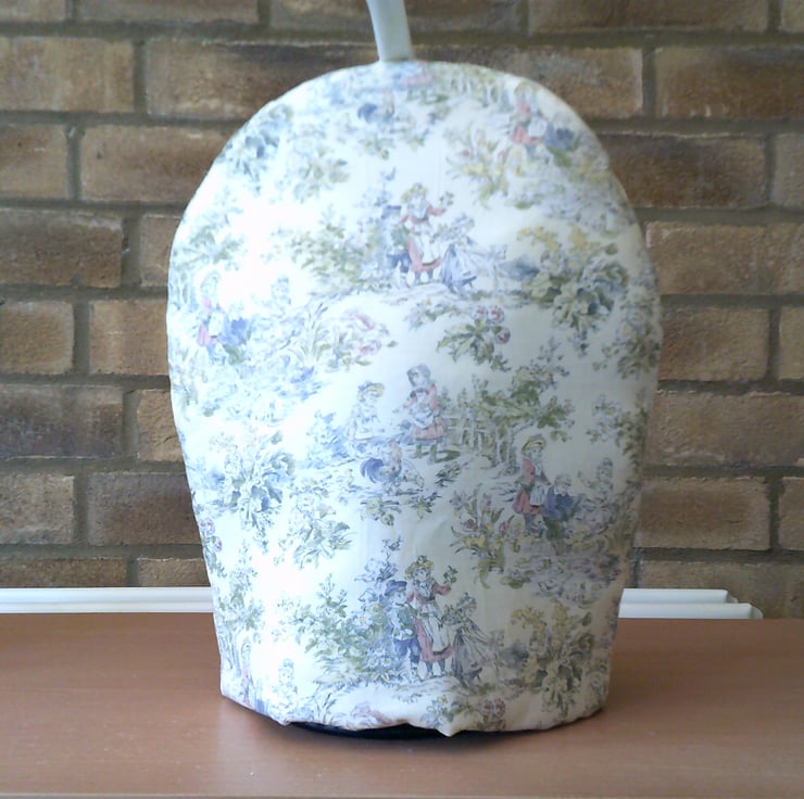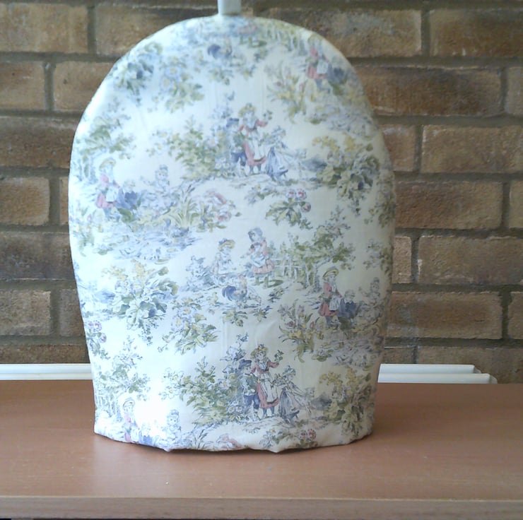 The fabric used for this coffee pot cosy is of vintage style figures on a cream background.