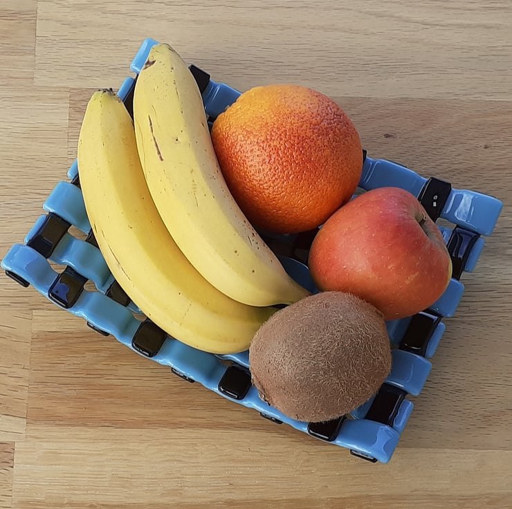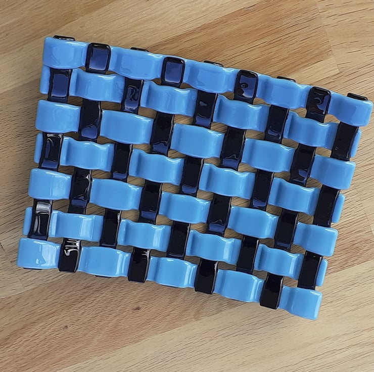 Fused glass shallow dish made from narrow strips of black and opaque blue glass. It takes three firings in the kiln to produce this effect. First, the blue glass is cut into strips and fired over ceramic formers and then alternate strips are turned over. Strips of black glass are threaded through the resulting channels and the piece is fired again to fuse all the strips together. Finally the piece is fired again over a former to produce the dish shape.