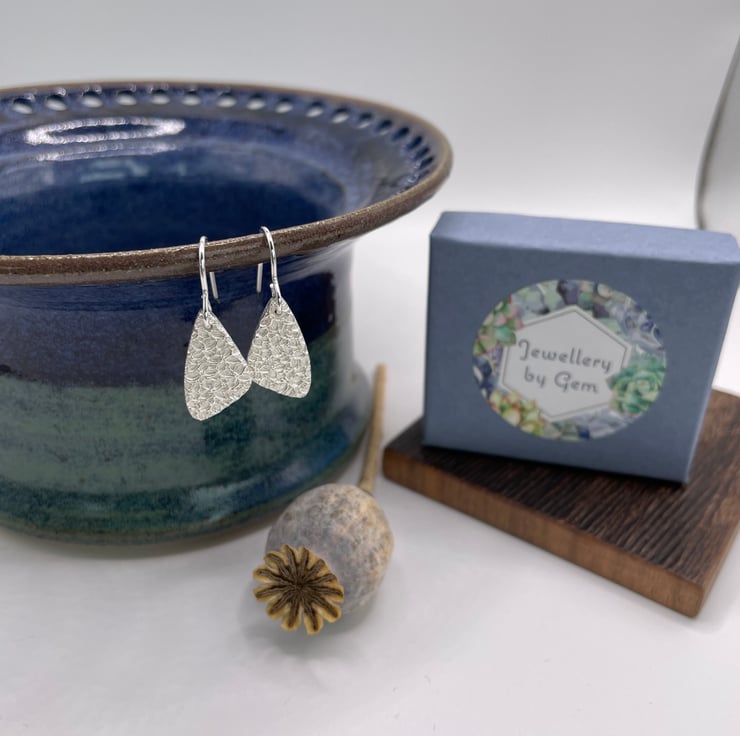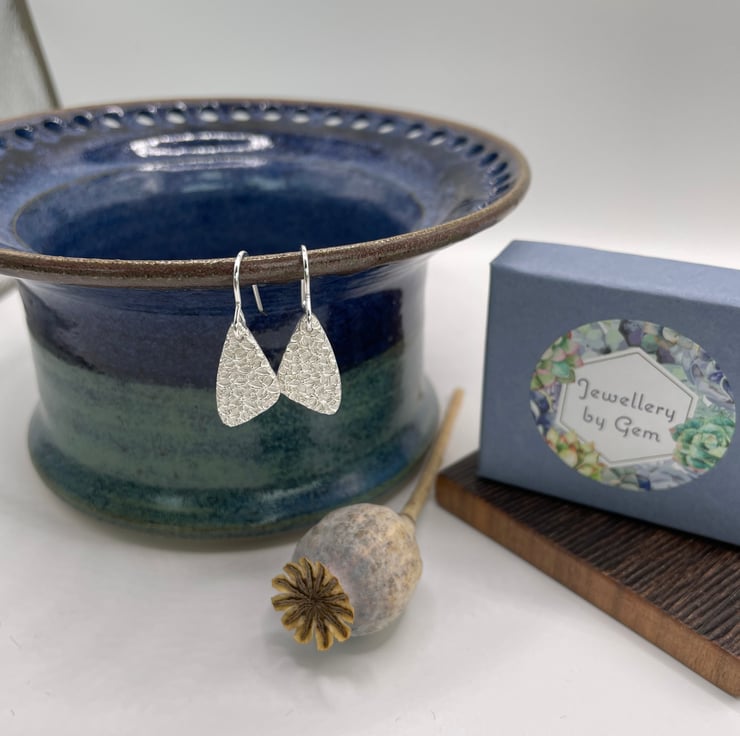 A lovely pair of everyday drop earrings that hang beautifully below the ear on sterling silver ear wires. They are textured with a petal style texture that catches the light enchantingly.