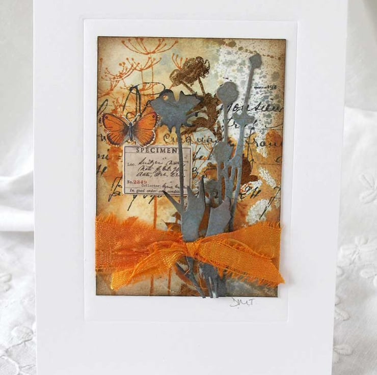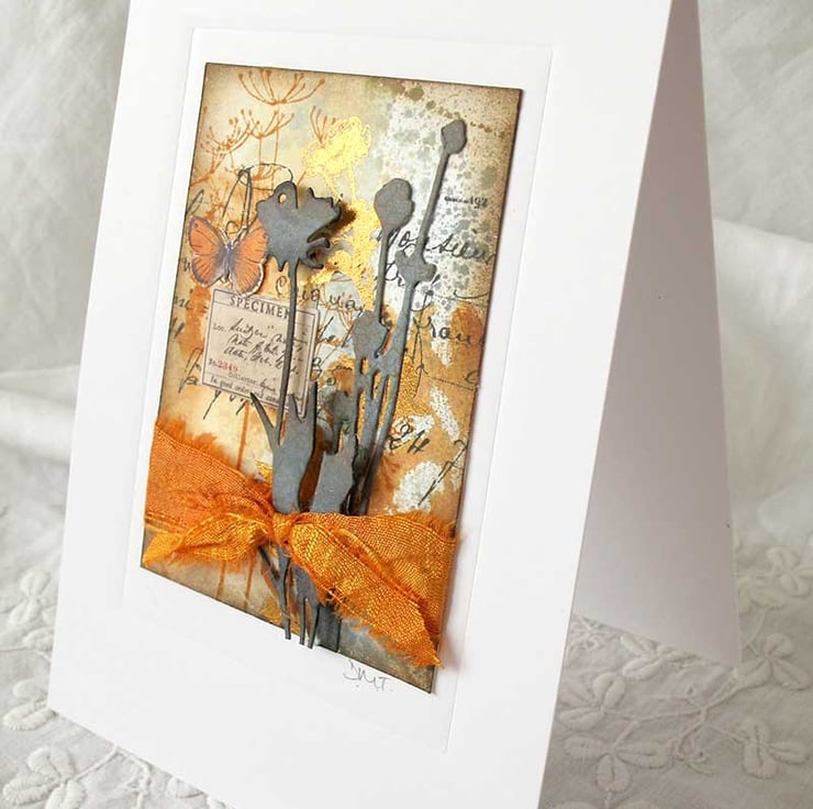 I draw inspiration for my art from my love of nature and the countryside. I enjoy using lots of different mediums to create my work, and often include found objects that I've collected over the years. For this card I have also used some Tim Holtz dies and stamps.
