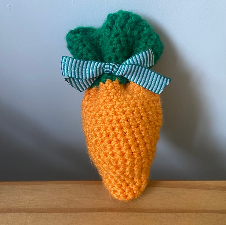 Handmade crochet carrot pouch with ribbon drawstring fastening.