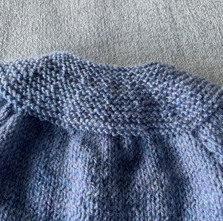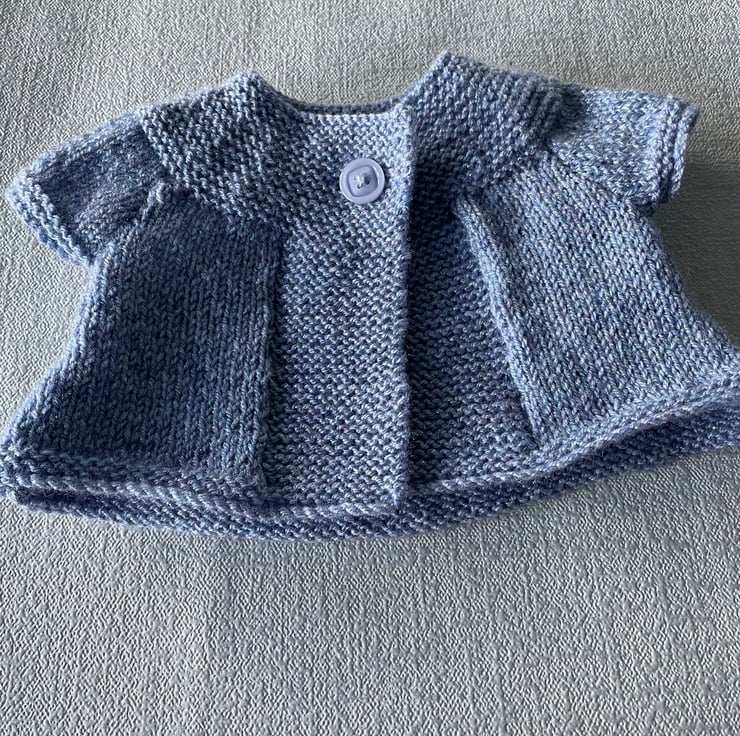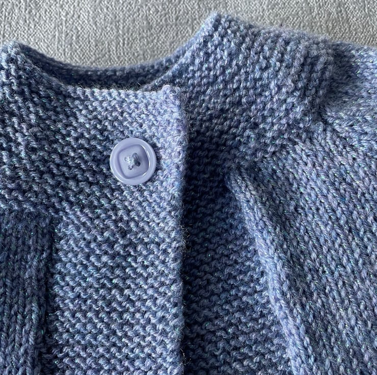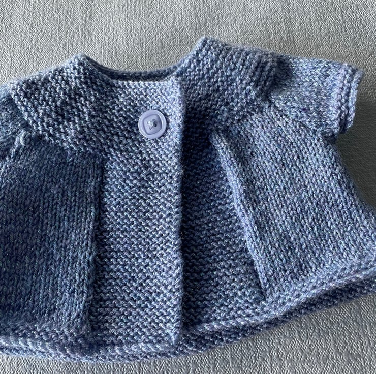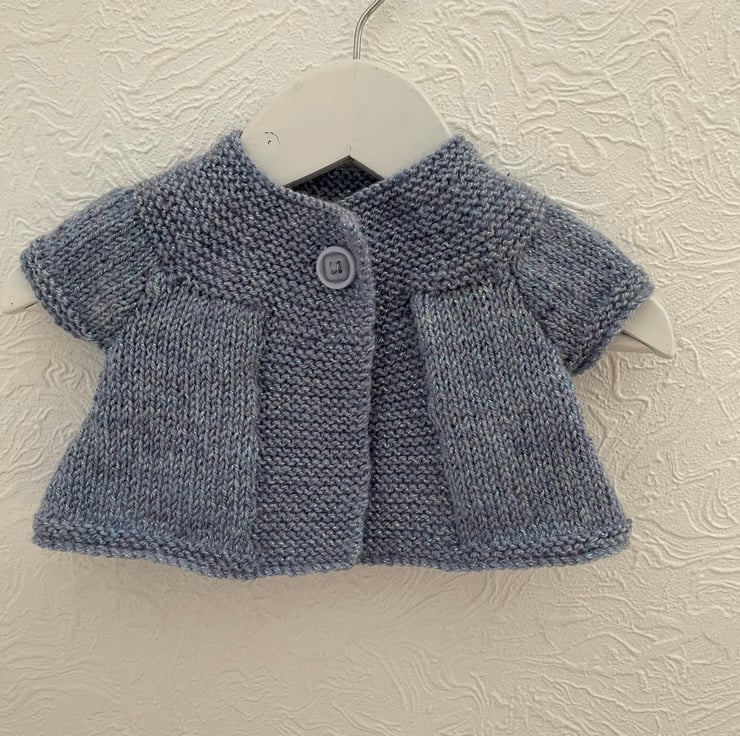 A pretty cardigan hand knitted in a glittery blue yarn. The swing style cardigan has short sleeves, a wide garter stitch yoke and front bands and fastens with a matching blue button.