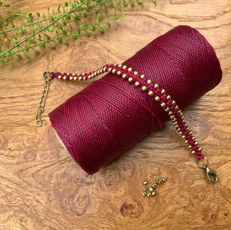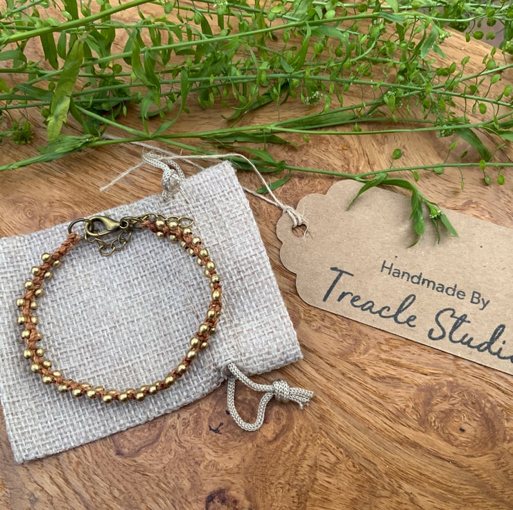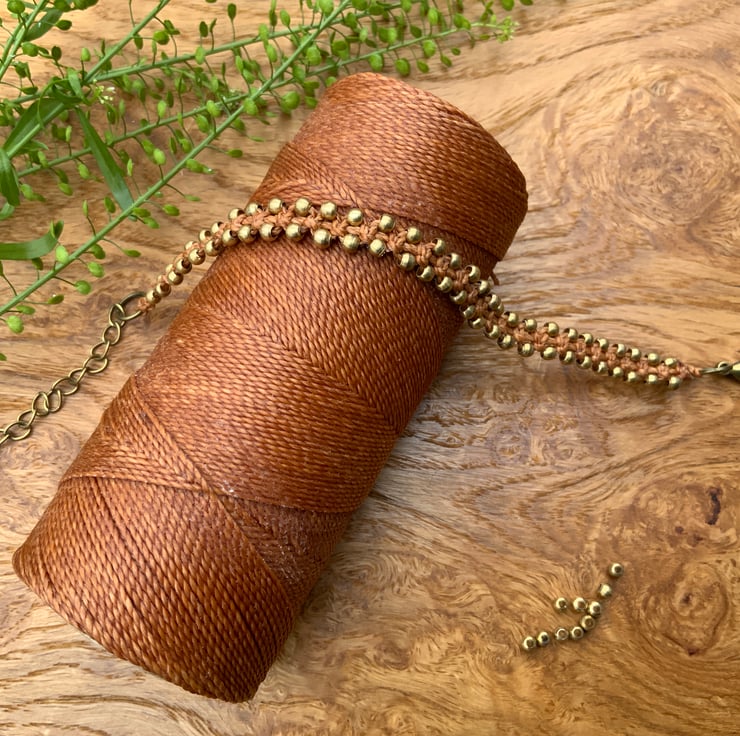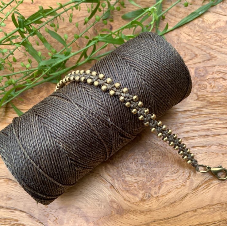 The bracelet is made from 1mm waxed macrame cord and 3mm brass beads. It fastens with a lobster clasp and has a 5 cm extender chain.