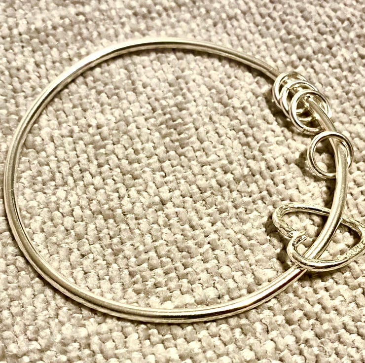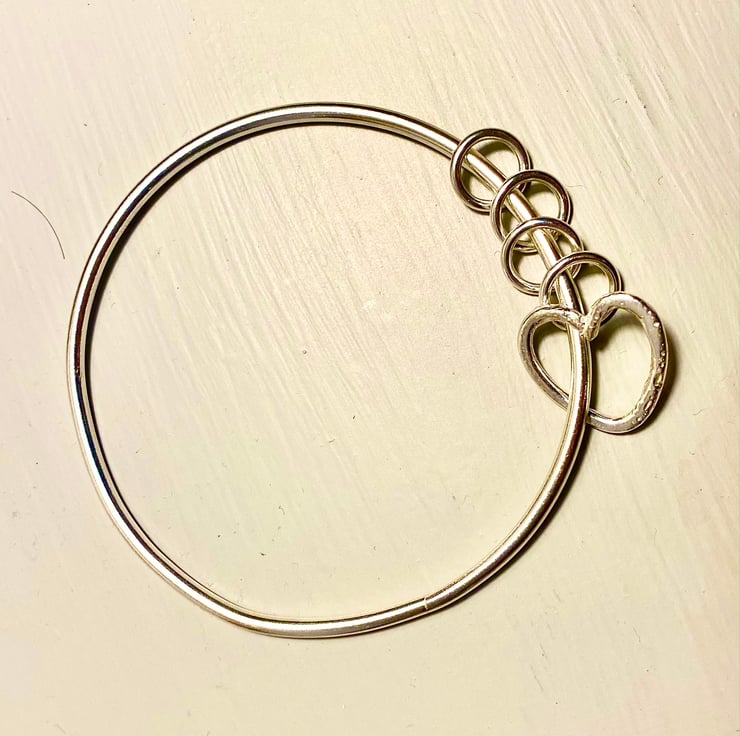 Handmade from 2.5mm round solid silver wire with a sliver wire heart and 3 jump rings which spin freely round the bangle as you move