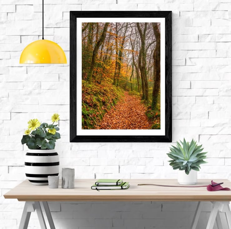 Taken at the end of Autumn this photo print is all about colour with the vibrant oranges and yellows contrasting with the greens of the ferns and grasses. The pathway is covered with fallen leaves of trees and allows the skeletal structure of the trees to show against the skyline. The image almost looks like a painting.