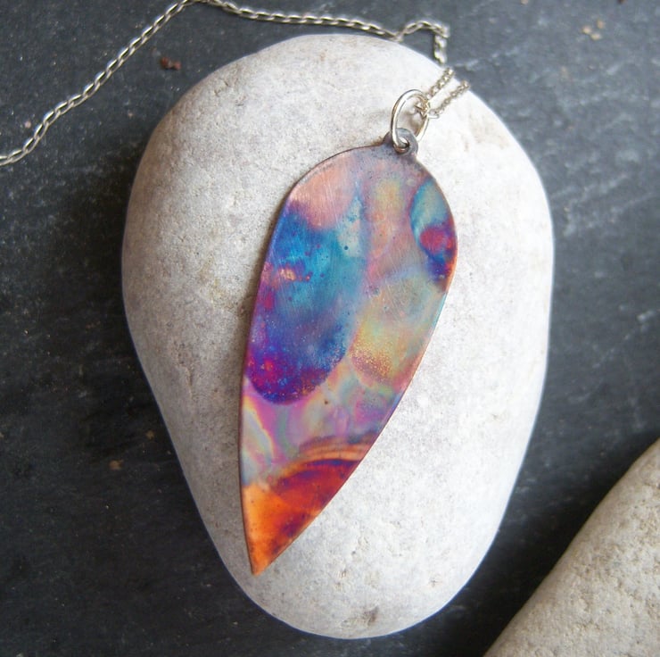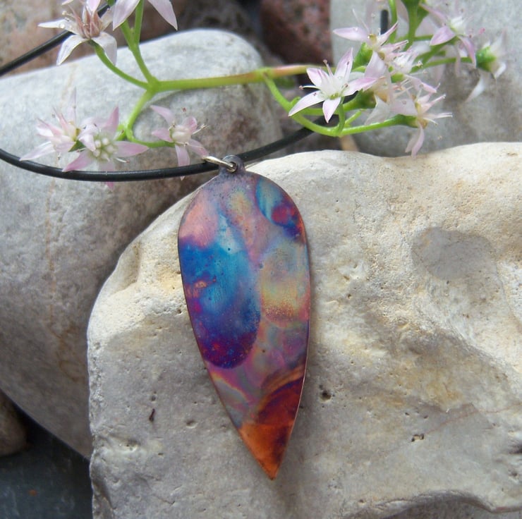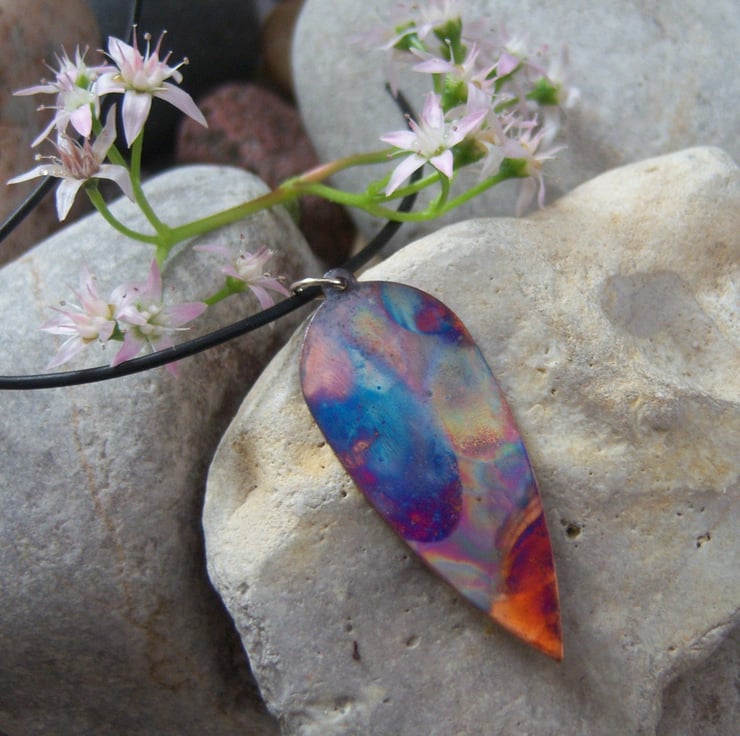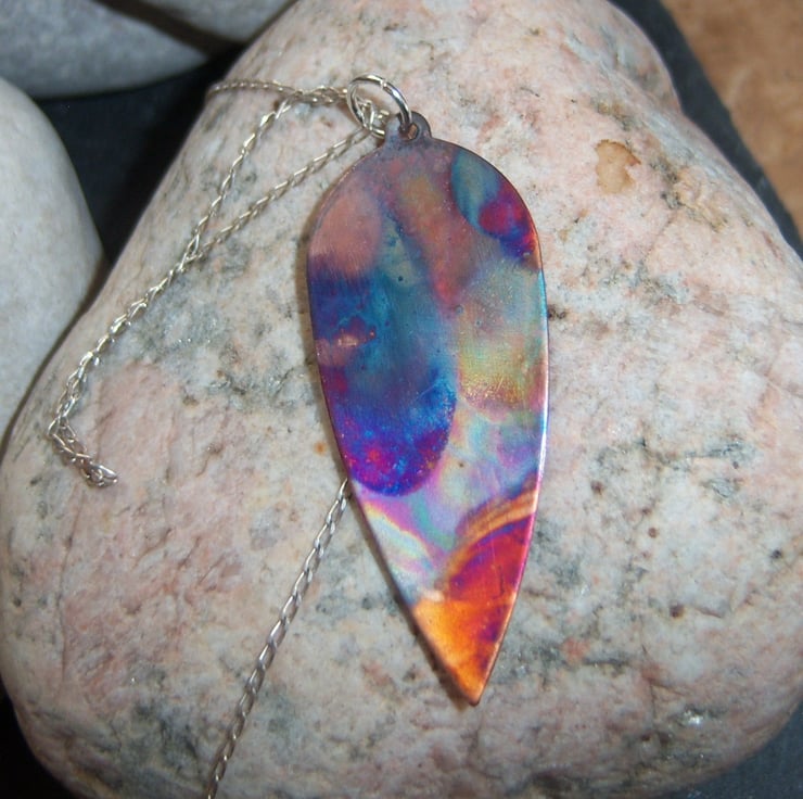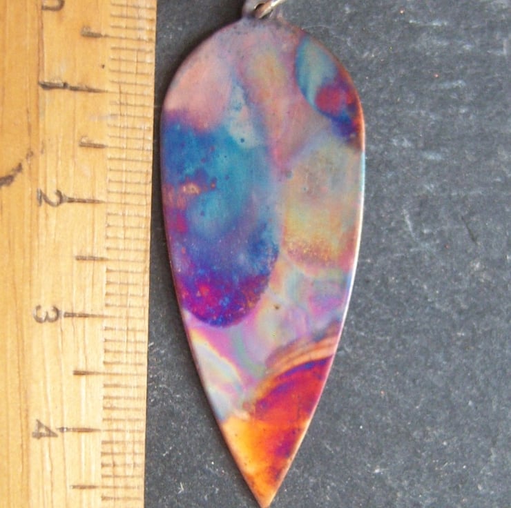 A copper leaf shape or teardrop that has been flame painted. This is a technique that produces a one of a kind effect, it cannot be replicated. It is done with a micro torch, producing different hues of pink, purple, blue, green, gold with each firing.