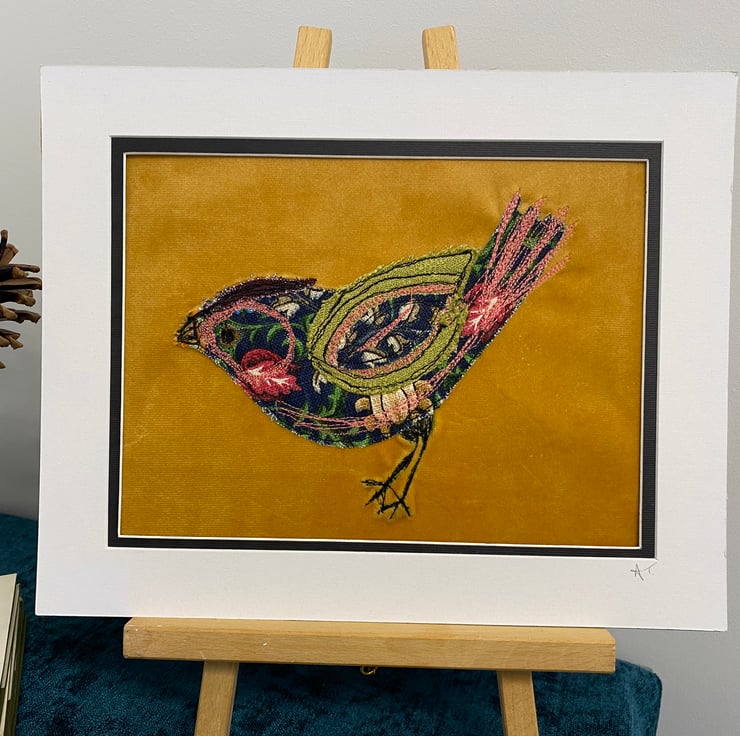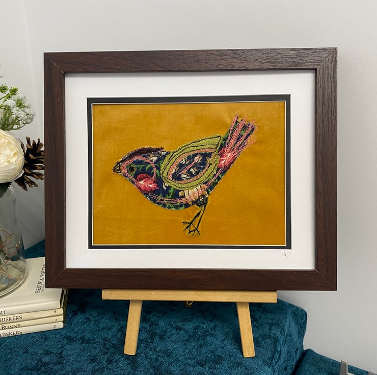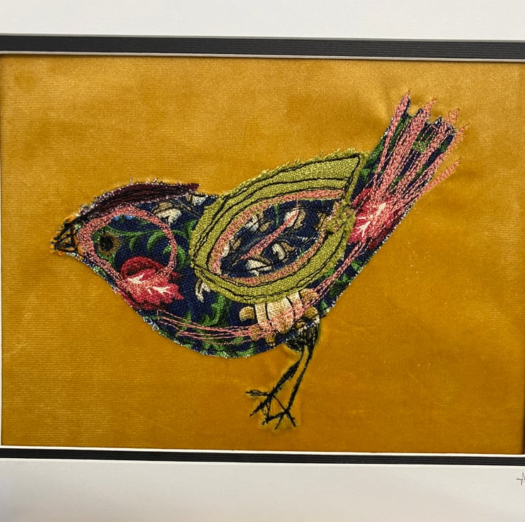 This bright garden bird is created with a mixture of appliqué and free motion machine embroidery. The main body of the bird is created from Fabric with the William Morris design 'Strawberry Thief". the wing is created with a bright green linen and a smaller piece of Strawberry Thief. The detail is created with free motion machine embroidery. The bird is stitched into a beautiful mustard yellow velour.