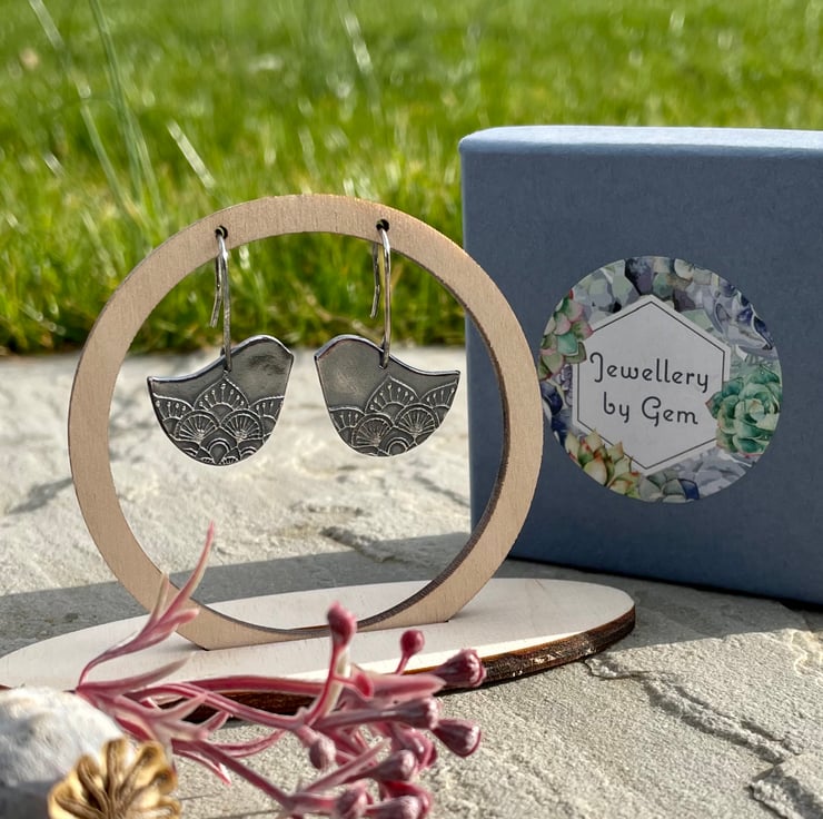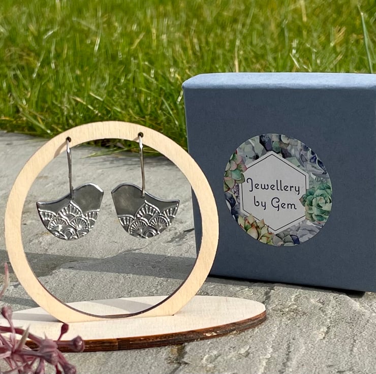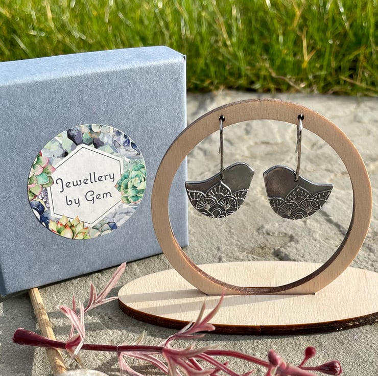 A fun, stylised bird earrings with mandala texture and hanging from sterling silver earring wires.