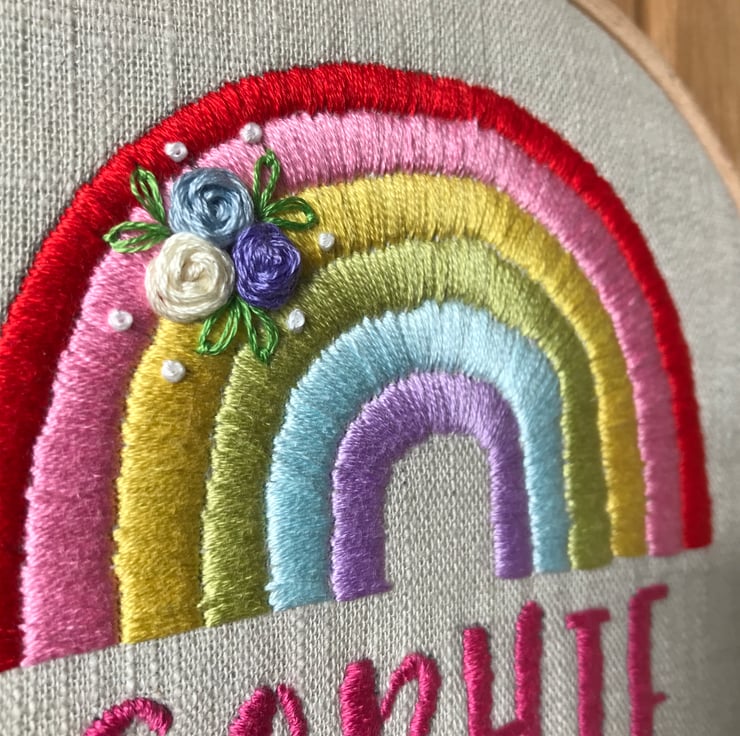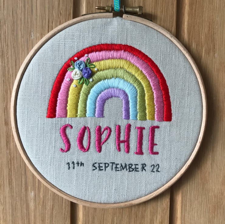 The design features a hand embroidered rainbow and name. With a hand stitched spray of little roses and leaves. Finished off in a 5" embroidery hoop and ribbon to hang on a wall.