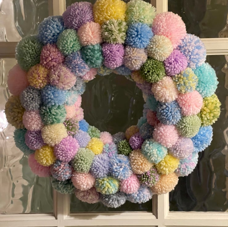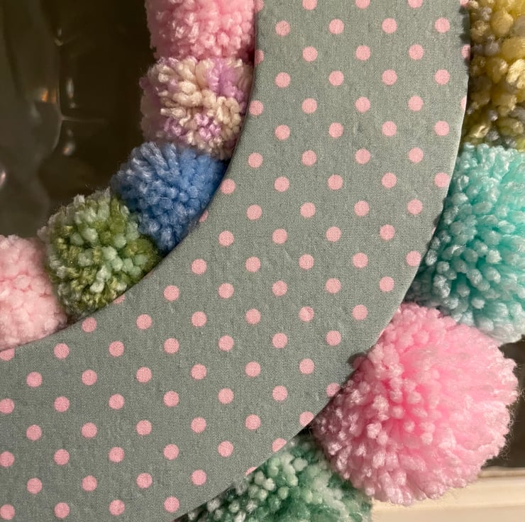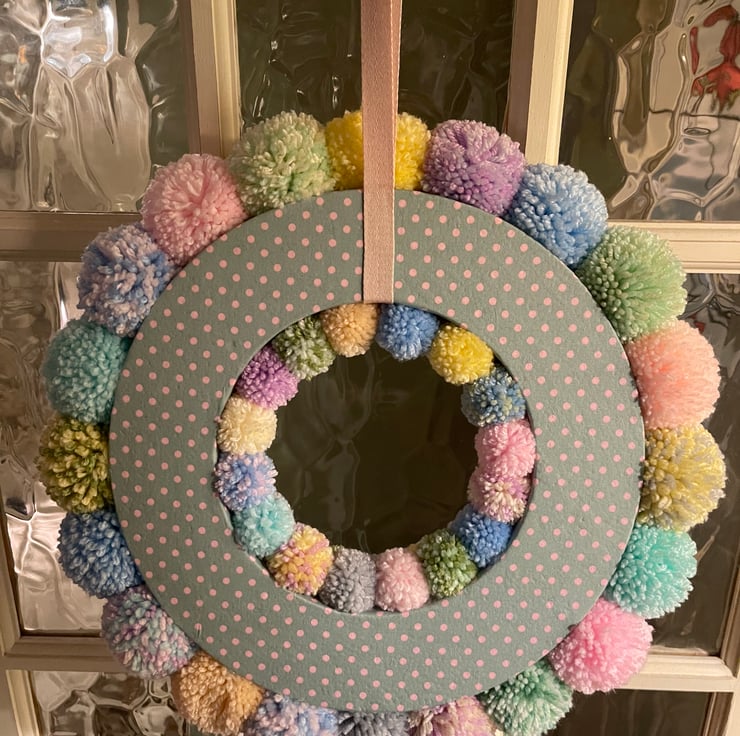 A beautiful handmade Pom Pom Easter inspired wreath, made with cute pastel coloured pom pons for the perfect Easter decor.