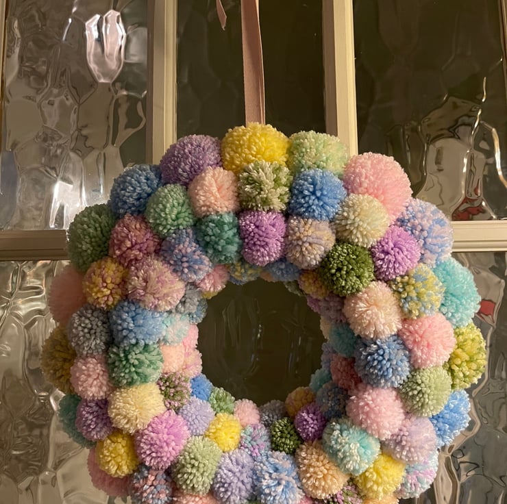 The wreath is made up of over 70 individually handmade pom poms attached to a 30cm x 30cm polystyrene ring. The size of the wreath with the pom poms attached is 35cm x 35cm.