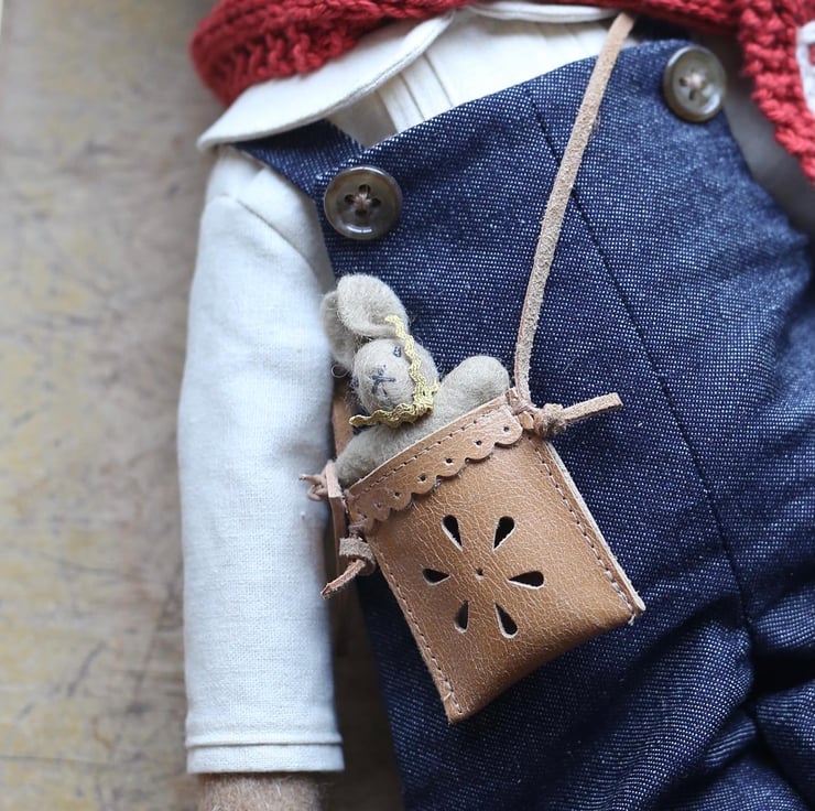 He has a tiny leather bag, hand punched with a daisy design and containing a baby bunny with a ric rac tie.