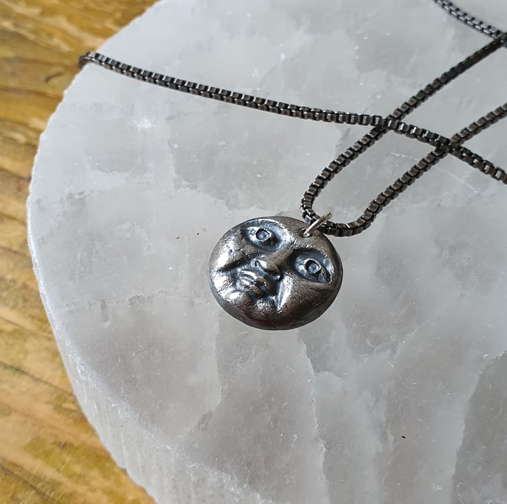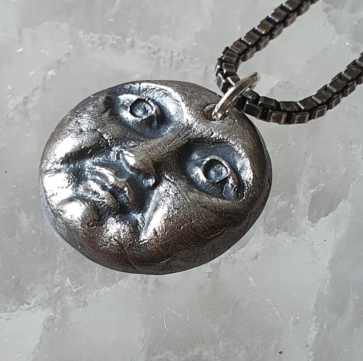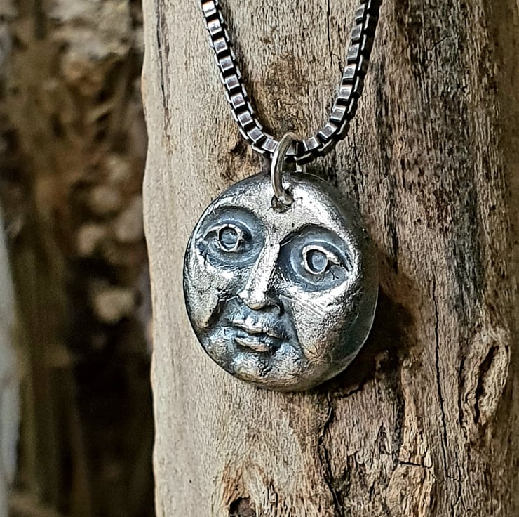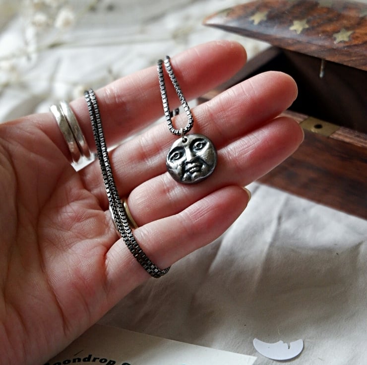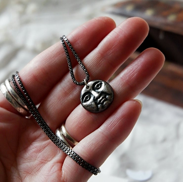 Handmade solid fine silver moon face pendant necklace with a genuine upcycled vintage solid silver box chain.