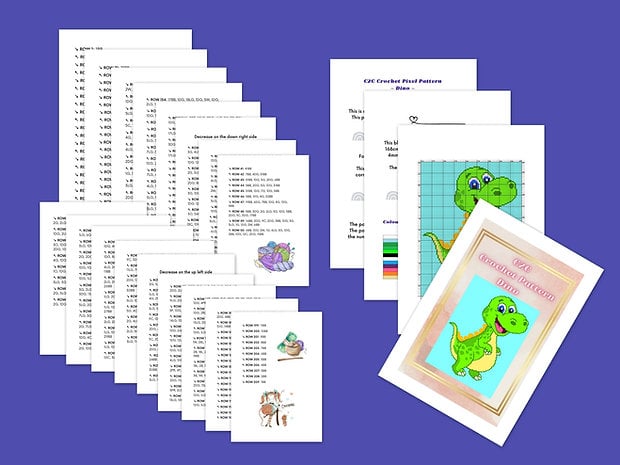 The PDF ebook contains a pattern for crocheters titled "Dino" with instructions to make the finished product.
