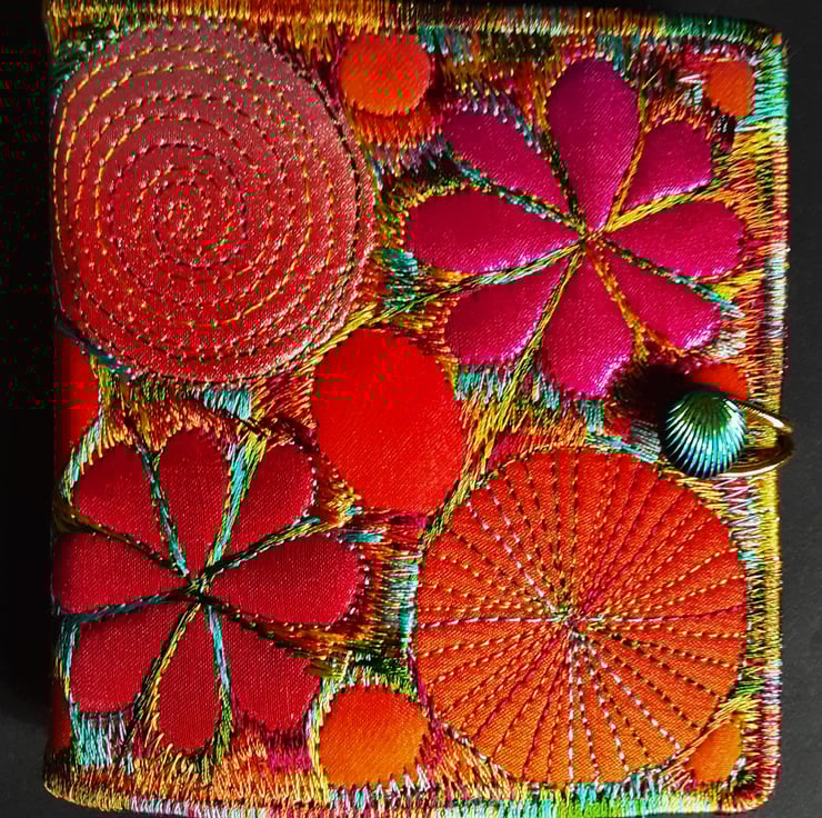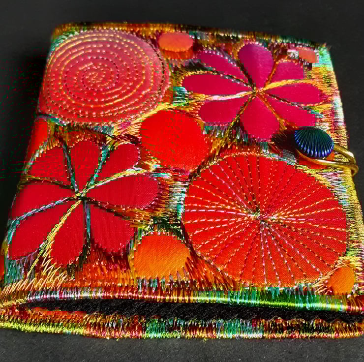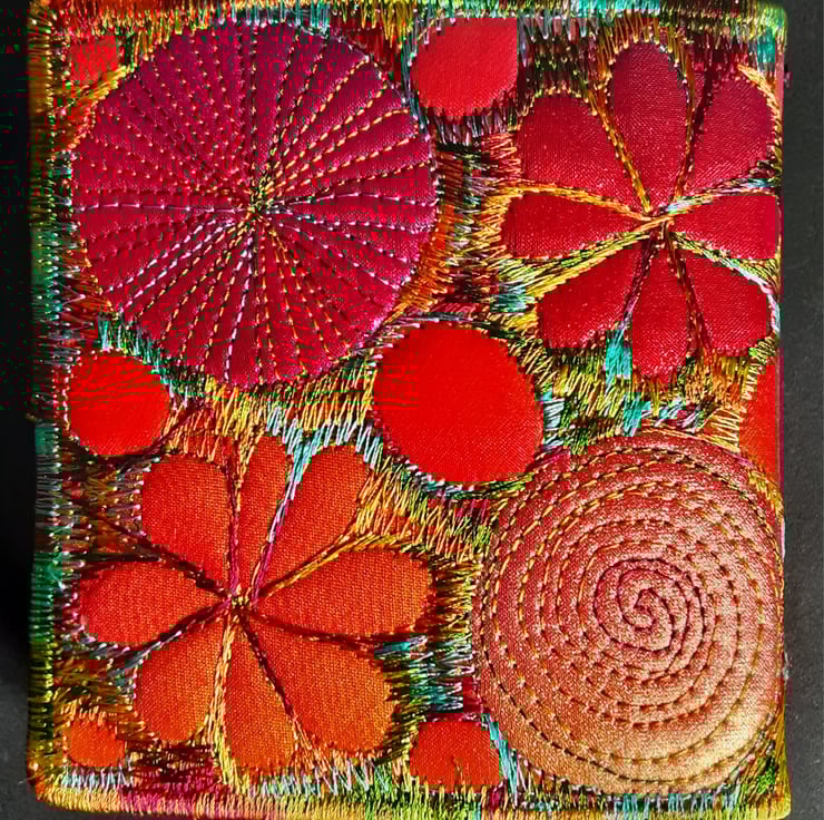 Made from layers of fabric including hand dyed Egyptian cotton and silk fabrics using the free machine embroidery style of sewing