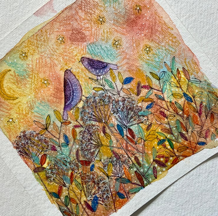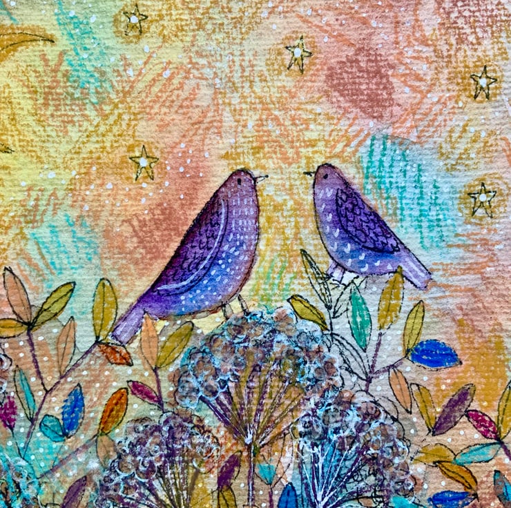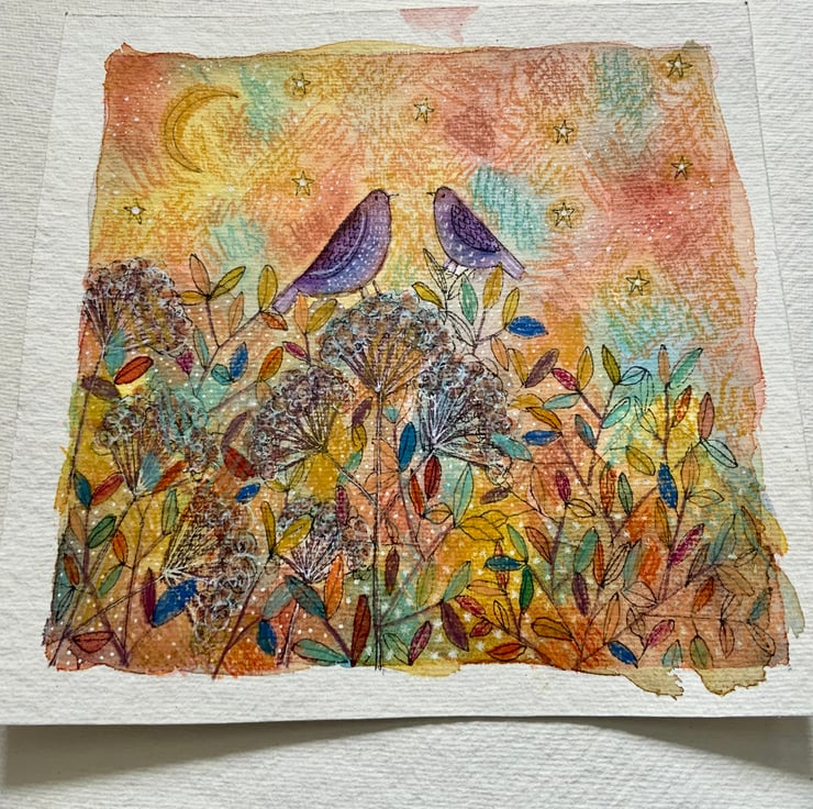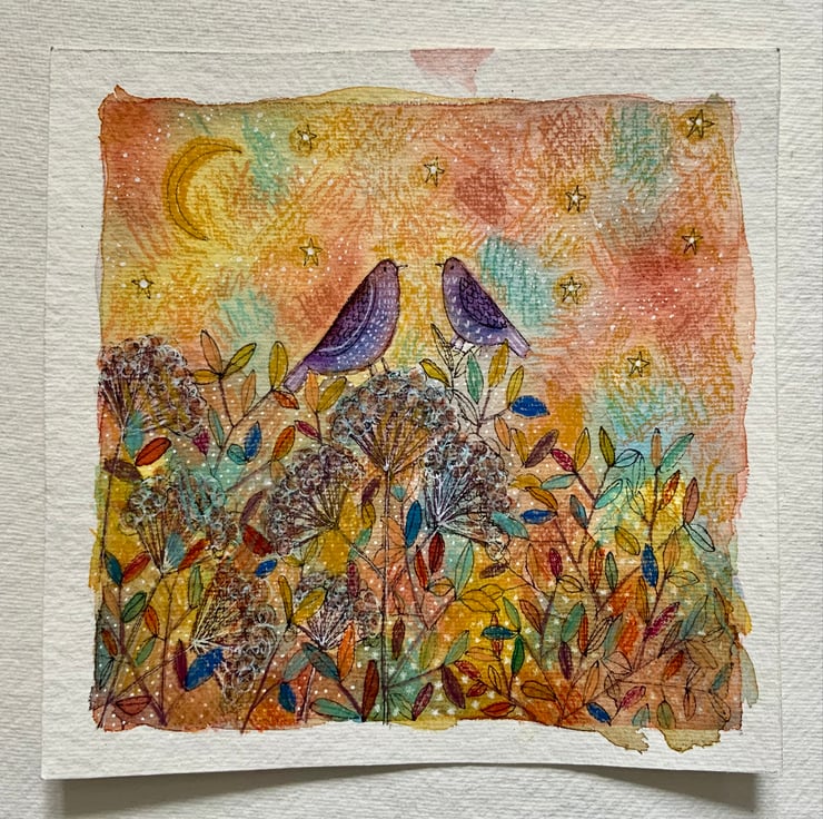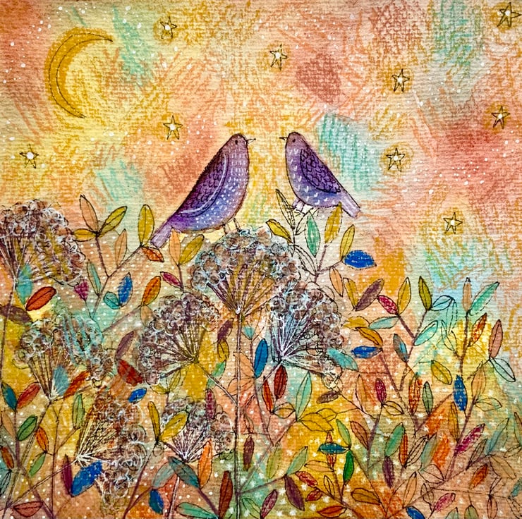 This is an original watercolour painting, which is painted on good quality watercolour paper, which measures 18x18cm the painted area is 15x15cm. It comes unmounted and unframed allowing you to choose a frame in your own style. It features two birds under a starry sky. It will be posted in a cardboard backed envelope. If you would like me to paint something similar, please don't hesitate to contact me.