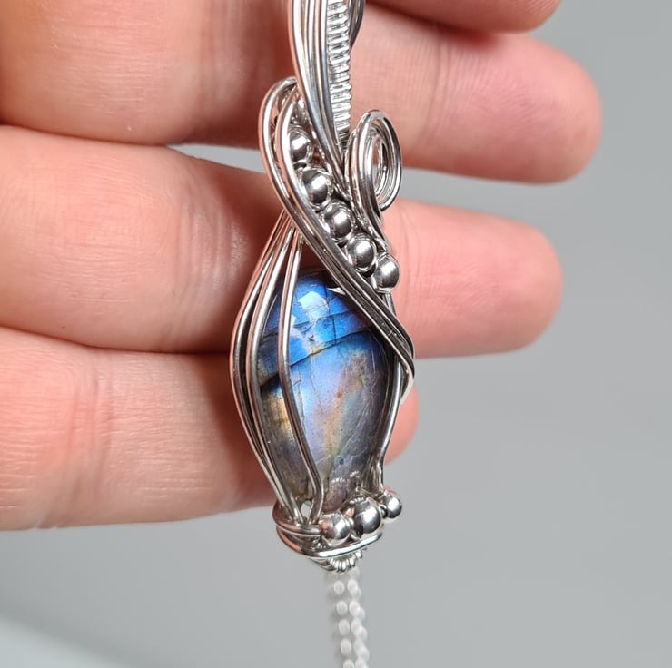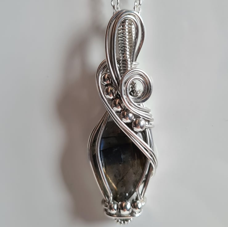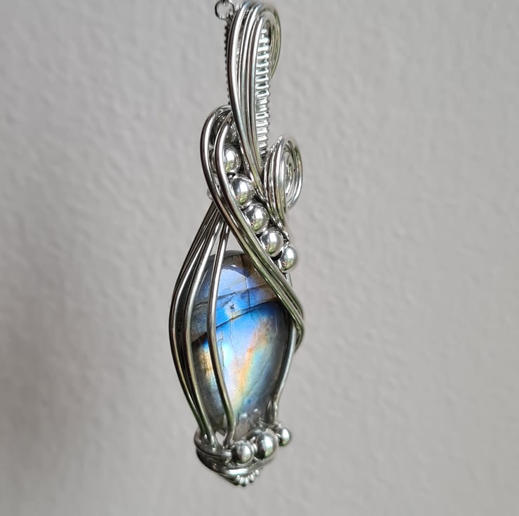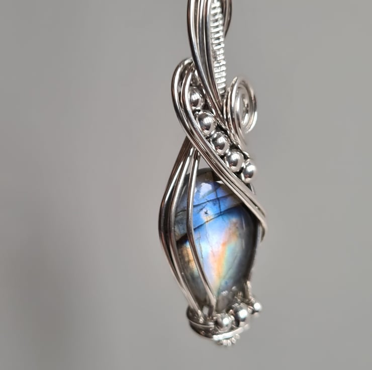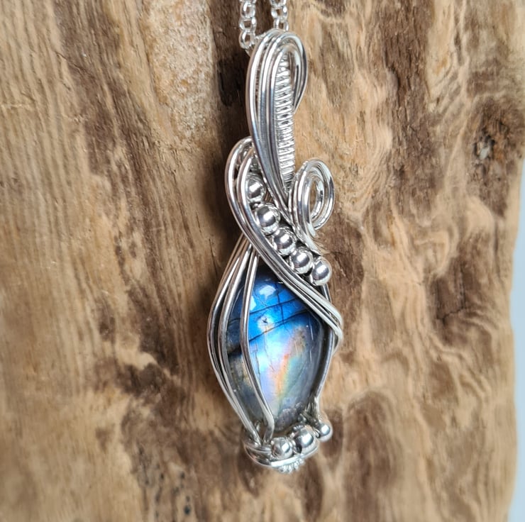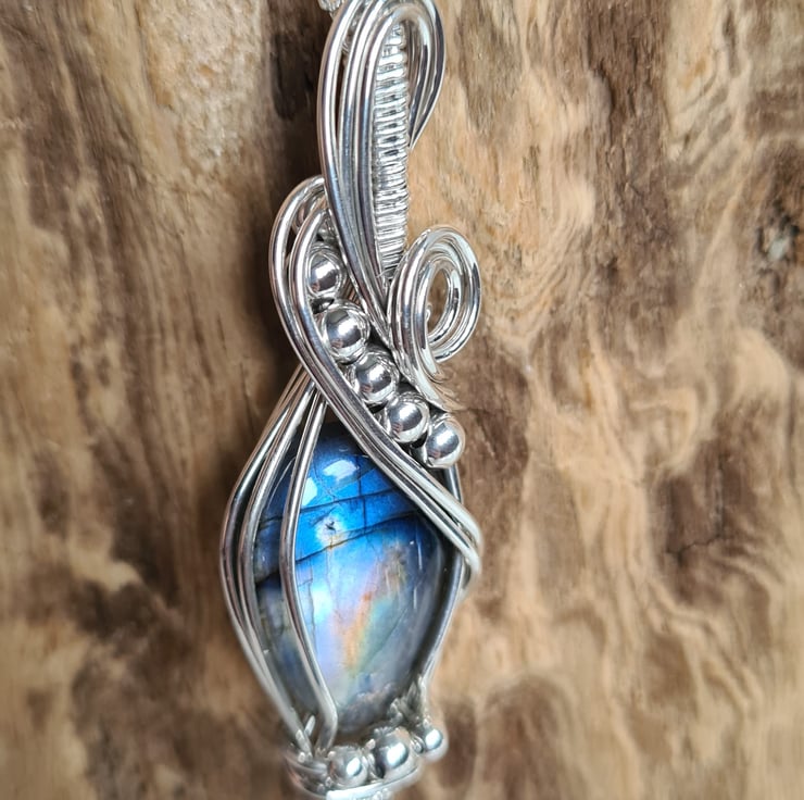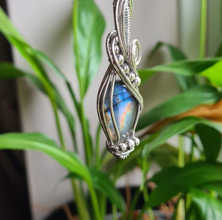 I have taken this beautiful and very unique Natural Labradorite and wrapped it in 925 Silver, and finished with 925 Silver balls into this final design. This labradorite has such a lovely flash of colour to the stone and a interesting and unique mix of blue with a little yellow/pink mixed in. Has a lovely calming energy.