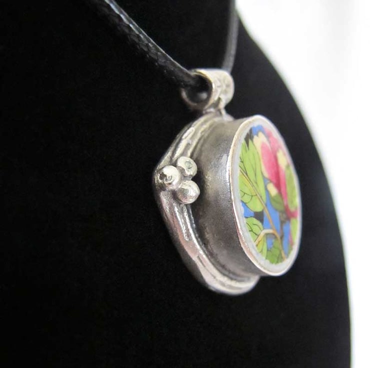 A beautiful hand crafted pendant made from a vintage china plate, in an antiqued silver metal mount. The pendant measures approximately 3cm tall including the bail, 3cm wide and 0.8cm deep.
