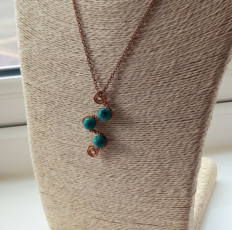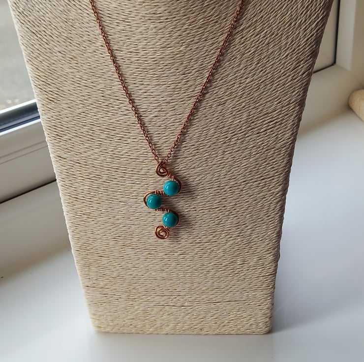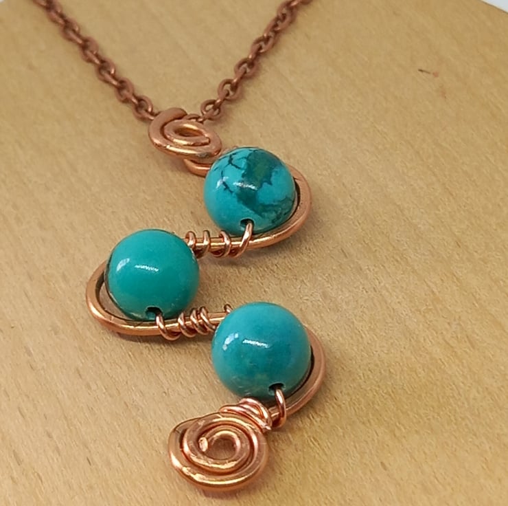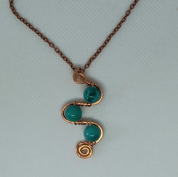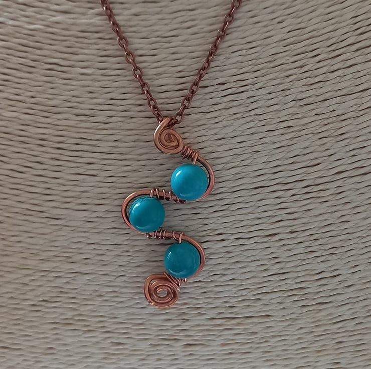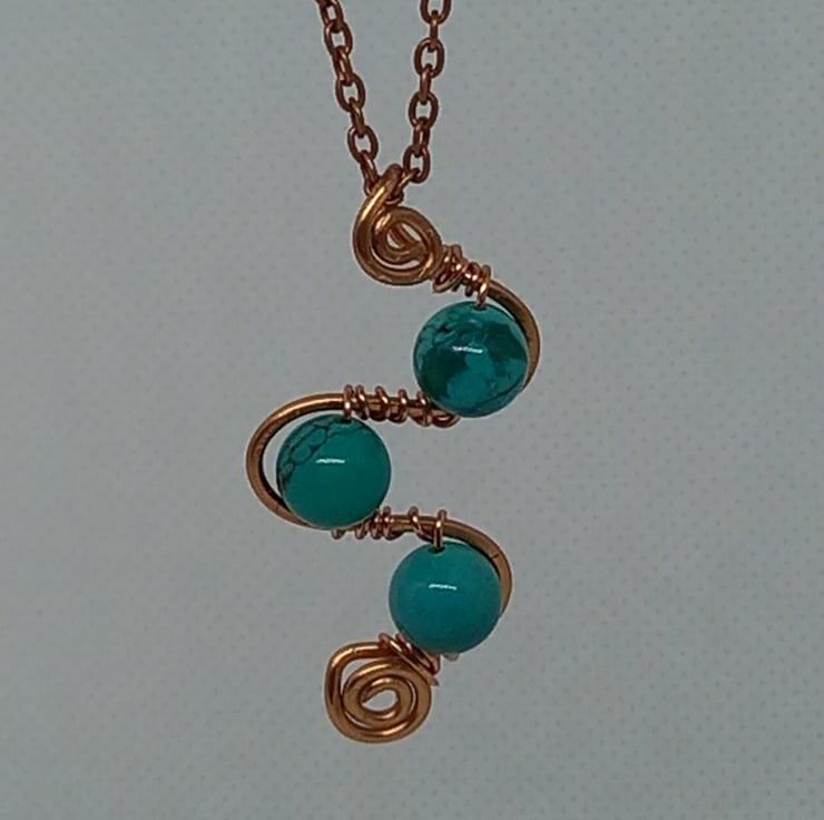 Swirls and loops of copper wire form the basis for this unusual pendant and 8mm turquoise beads add the finishing touch. The copper wire has been gently hammered to strengthen it and add texture and the beads are held firmly in place by wire wrapping them onto the loops. There is a spiral design at the base and also at the top, which forms into a bail for the copper chain, which fastens with a simple lobster clasp.