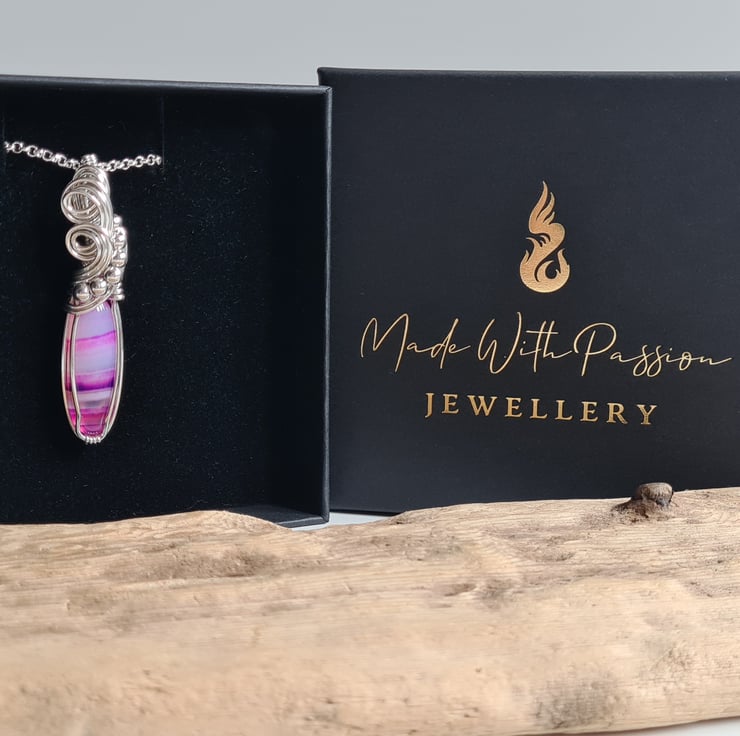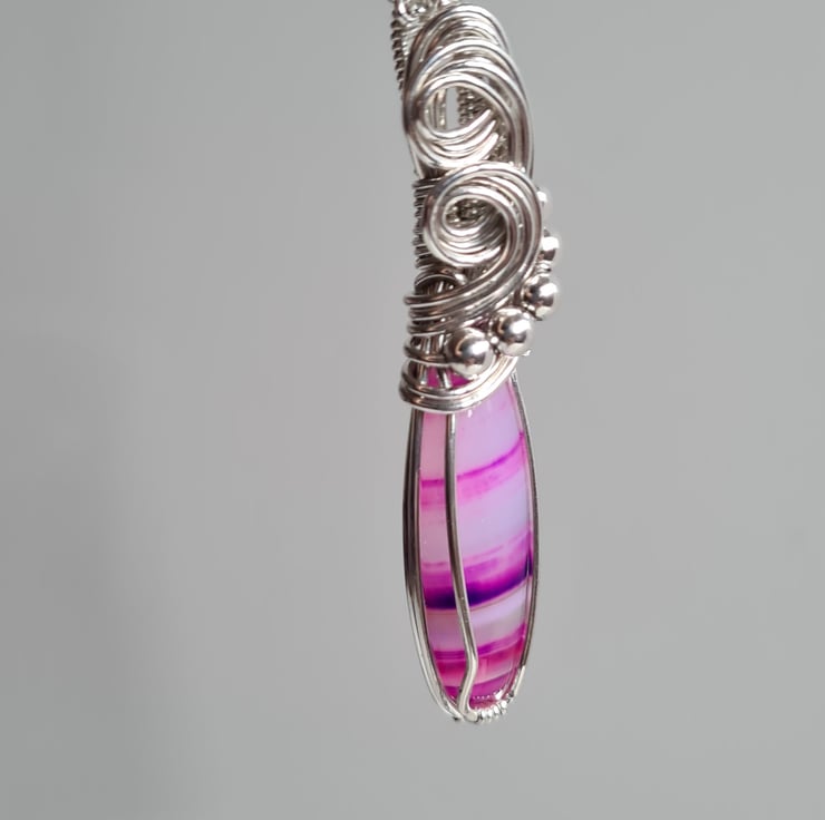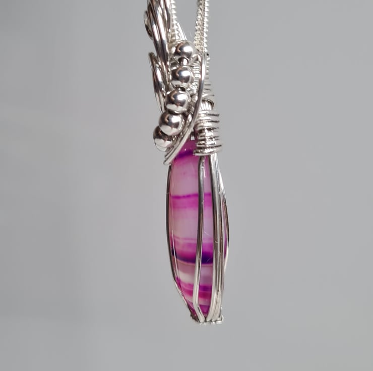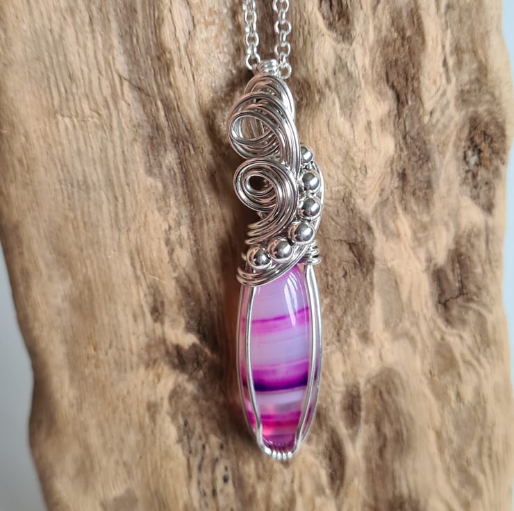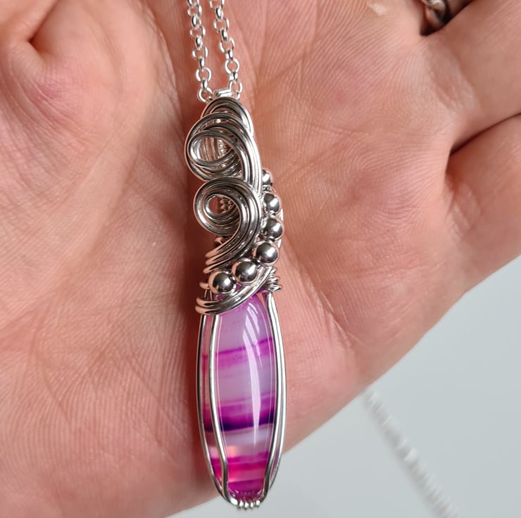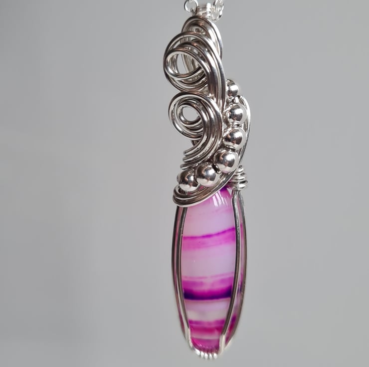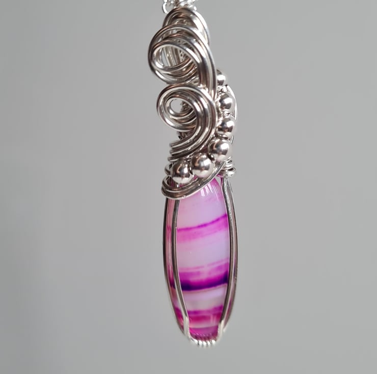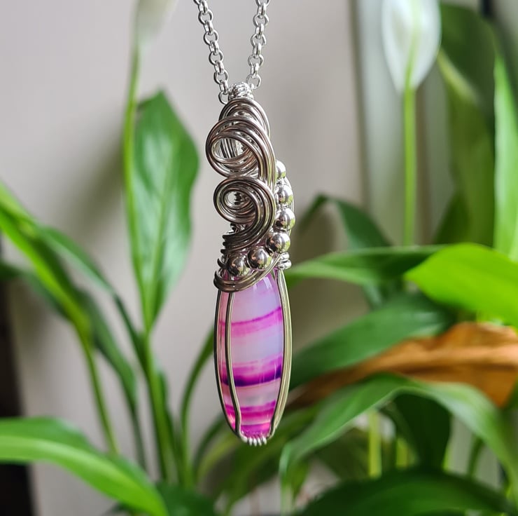 I have taken this stunning bright pink Natural Botswana Agate stone and hand wrapped it with 925 Silver into this unique design, finishing with sterling silver beads. This stone is very unique and has lovely transparent bands of pink and purple running through.