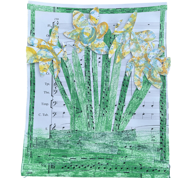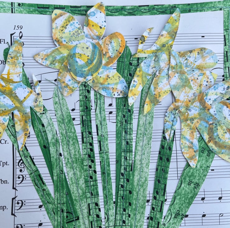 This paper collage echoes the loveliness of the colours with watercolour painted papers cut out for the flower heads and sewn with green stalks (musical painted papers) onto the music paper background.