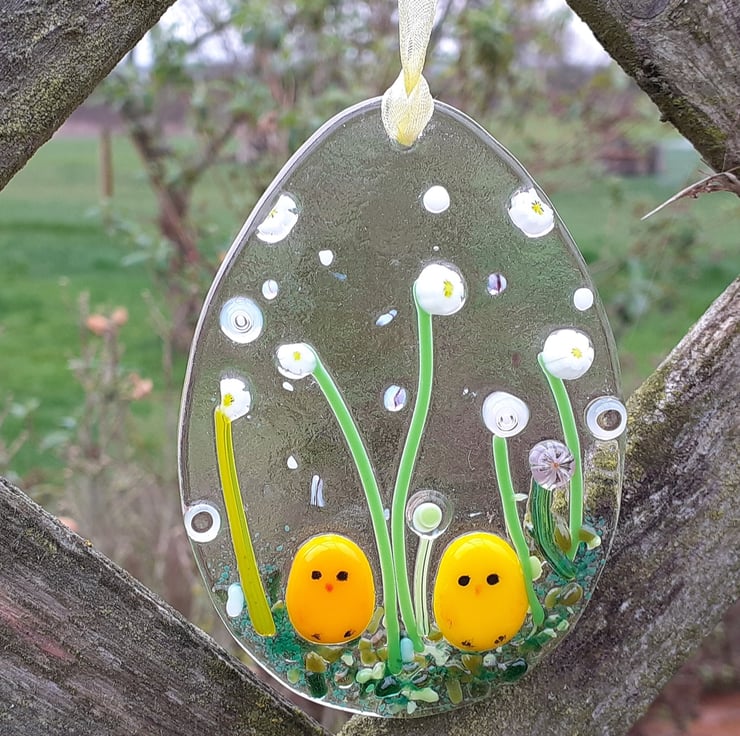 The glass egg is cut from clear glass and decorated with coloured glass powders, chips, murrini and vitrigraph. The chicks are cut from two shades of opaque yellow glass and their features added using glass enamels. The decorated egg has been fused in my kiln to 745 degrees, a temperature which allows the separate pieces to fully fuse together, while maintaining texture. The decoration has then been drilled and threaded with a soft yellow organza ribbon, ready for hanging.