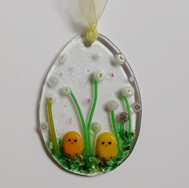 Fused glass Easter egg hanging decoration, depicting two little yellow chicks. This would make a lovely gift for Easter (and will last longer than chocolate ! ).