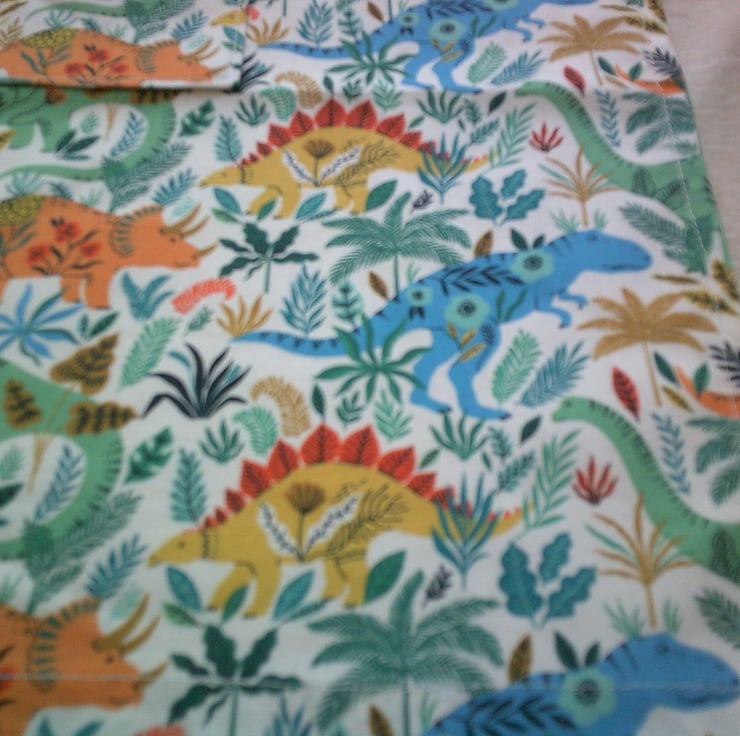 The design on fabric used for this apron is of colourful Dinosaurs in blue, green, orange and yellow with foliage on a white background.