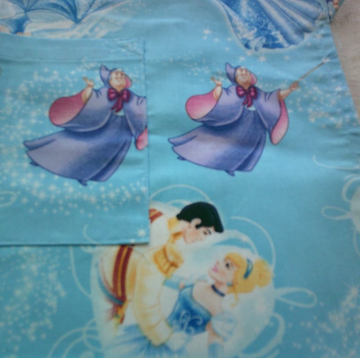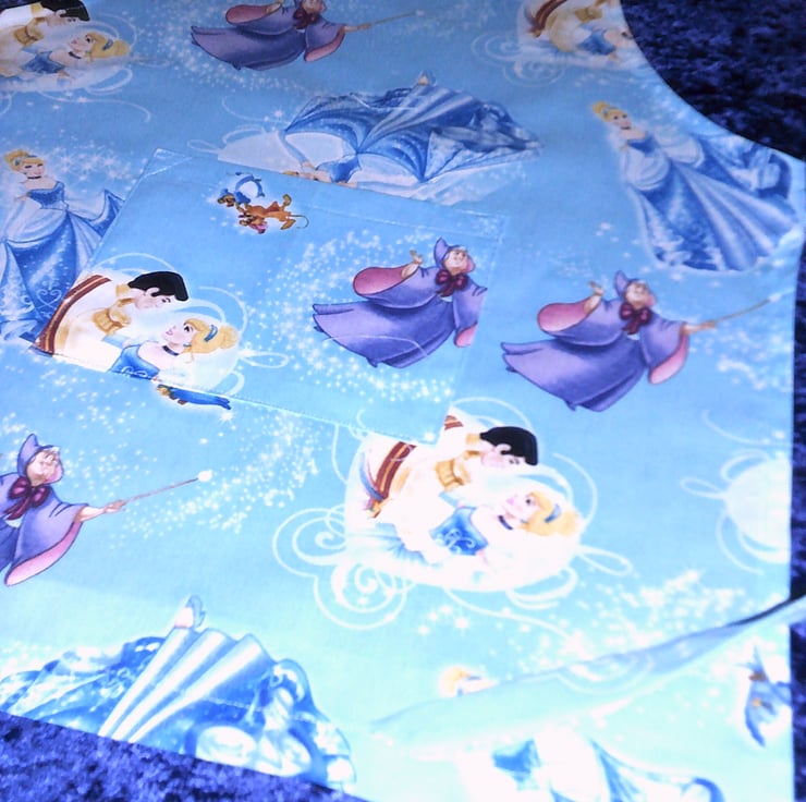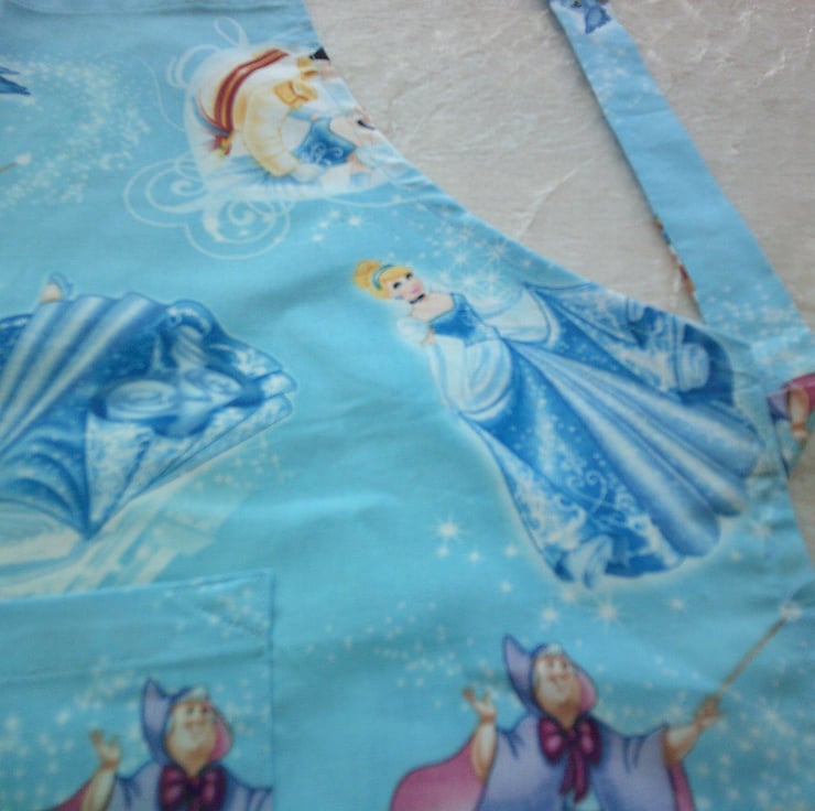 The design on fabric used for this apron is of Cinderella with her Fairy Godmother, handsome prince and mice on a blue background.