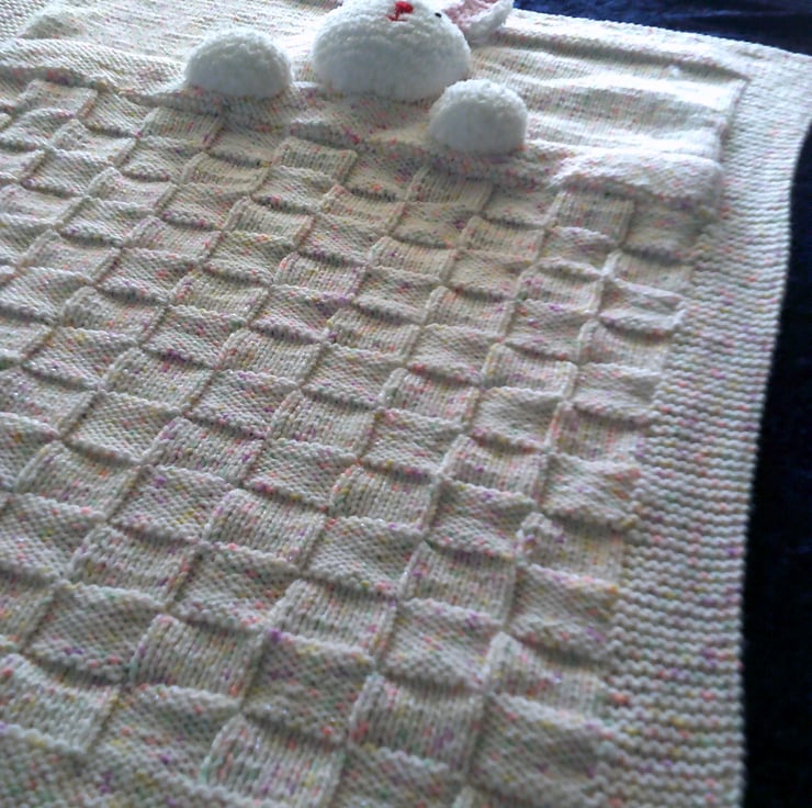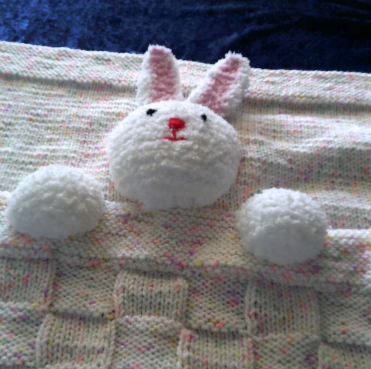 This hand knitted Pram Blanket is made using a white sparkly acrylic yarn with pink and dark pink flecks and has a white rabbits head and paws on the top.