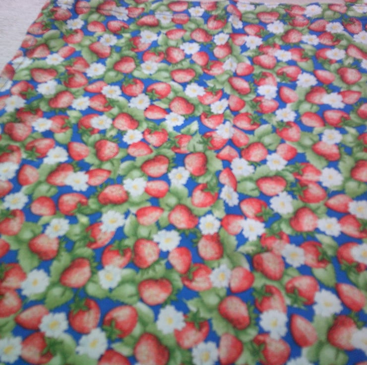 The design of the fabric used for this apron is of strawberries with flowers and leaves on a blue background.