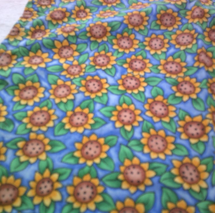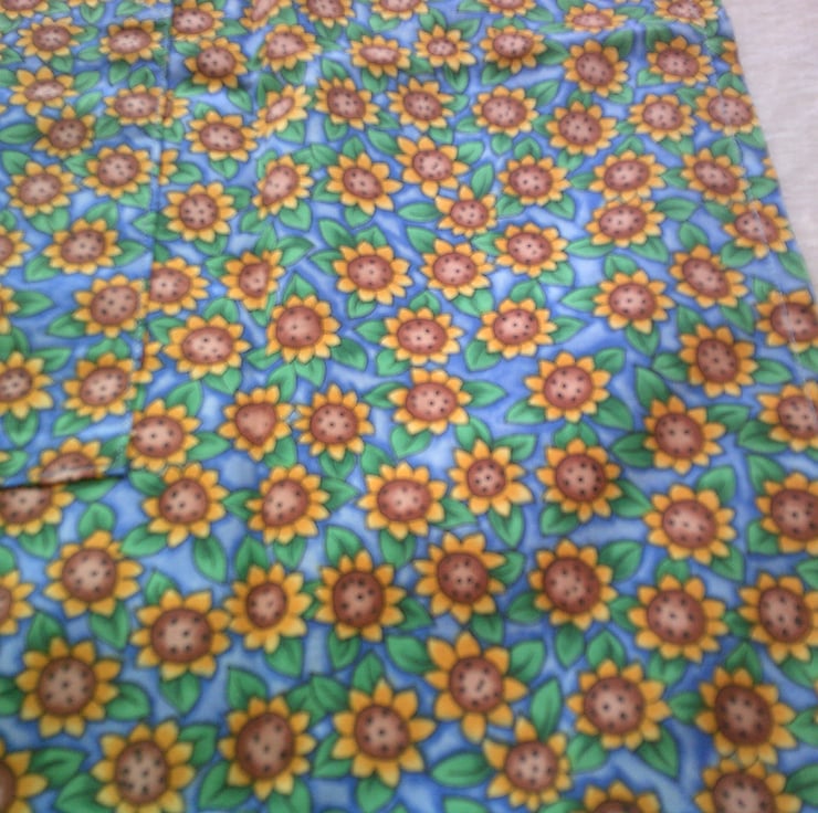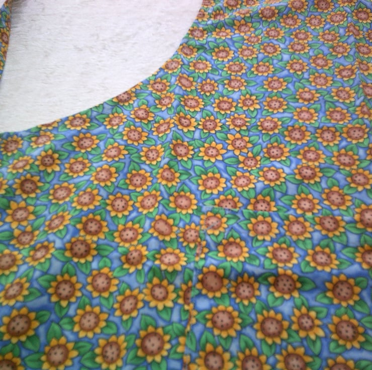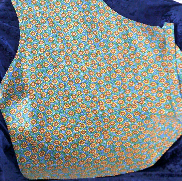 The design of the fabric used for this apron is of small sunflowers on a blue background.