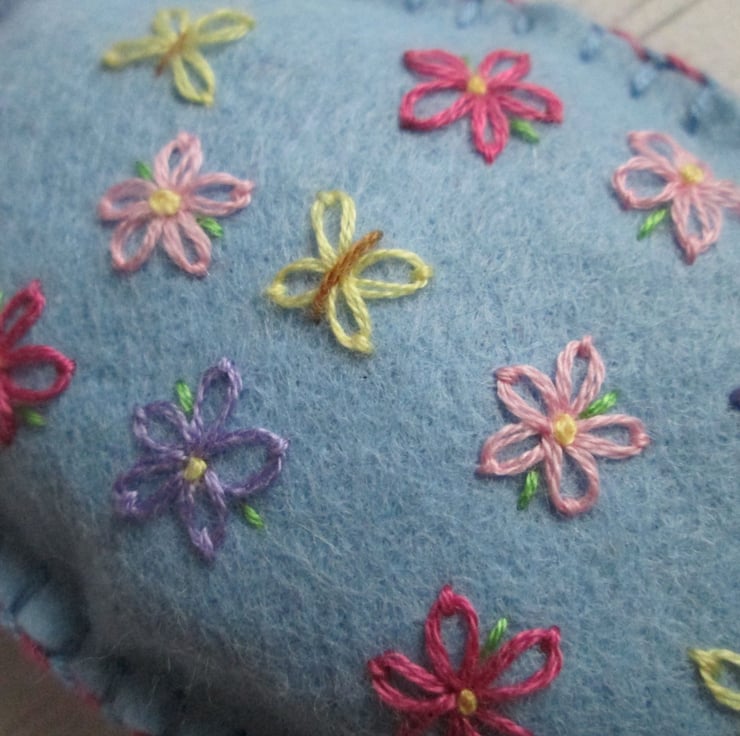 A Easter / Spring egg decoration in soft blue wool felt, hand embroidered with a scattering of pastel flowers and little yellow butterflies. Lightly stuffed with polyester wadding and finished with whipped blanket stitch, hanging loop and a pink organza bow. the egg measures approximately 11cm x 6.5cm with an 8cm hanging loop.