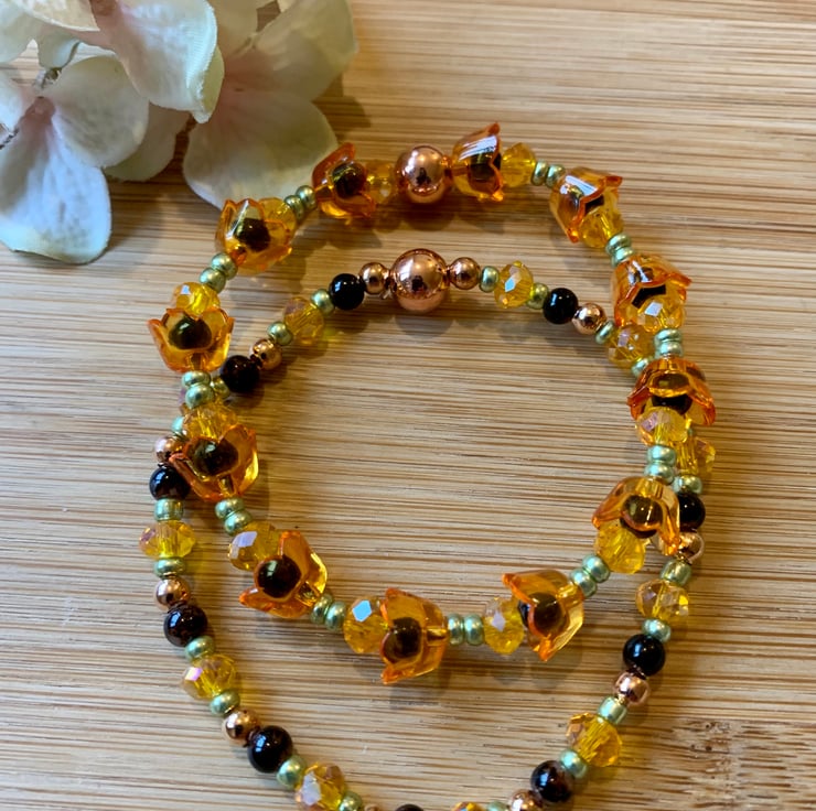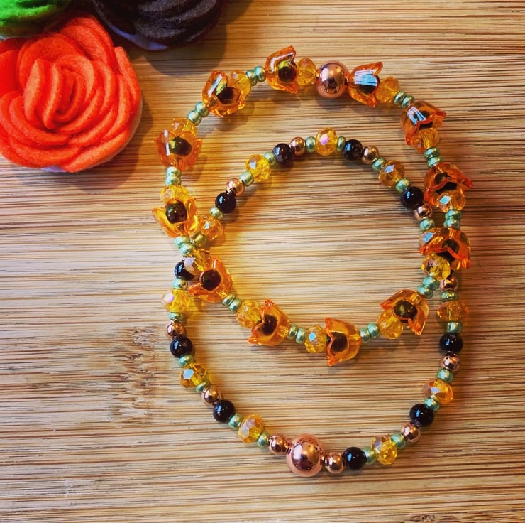 Stacking Floral bracelets made using lucite vibrant orange flowers, cocoa coloured beads, satsuma crystal faceted beads and rose gold. Wear this Spring to bring sunshine to your day. Handmade using strong jewellers elastic cord and will fit between 7 and 8 inch wrists.