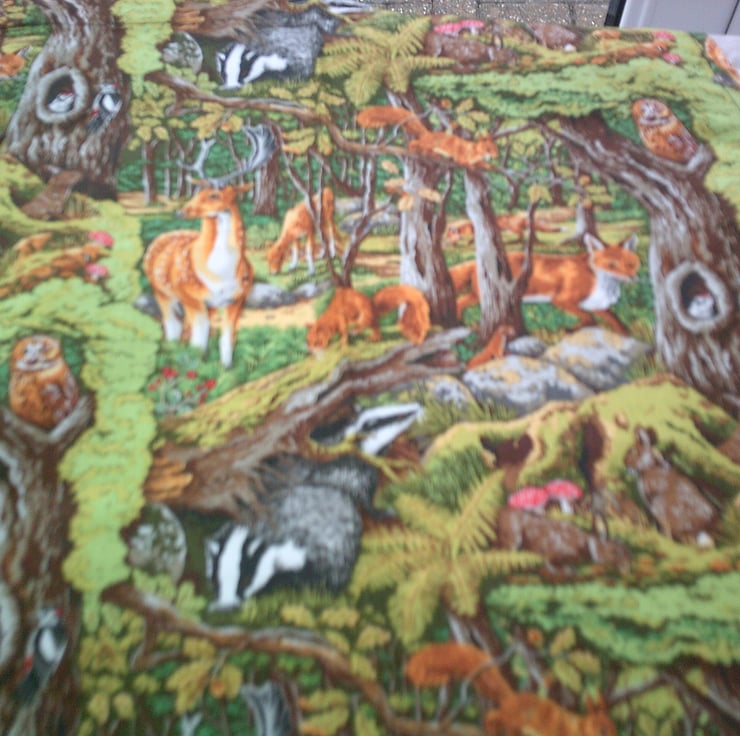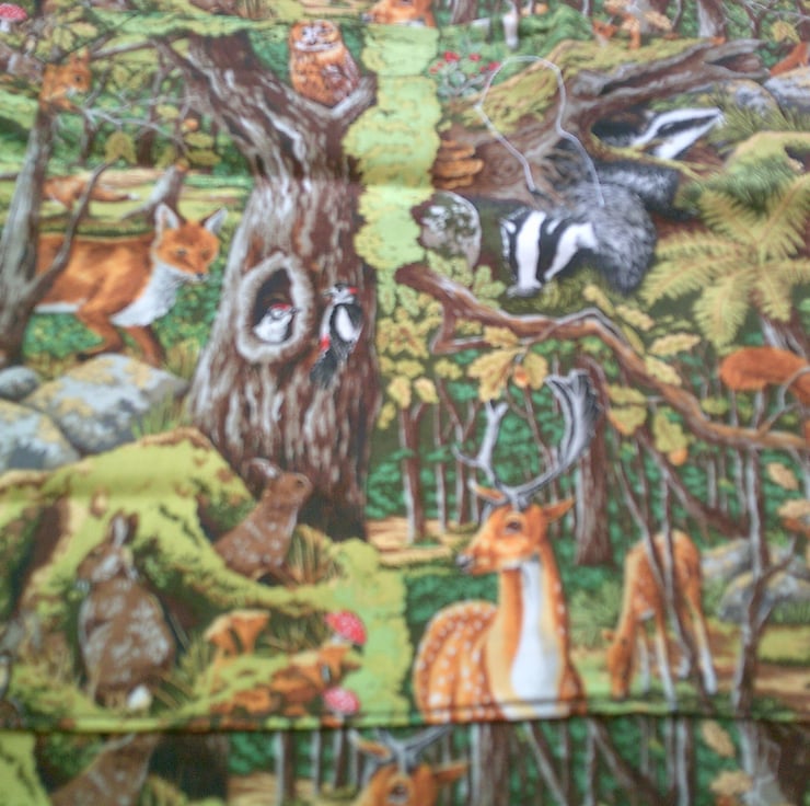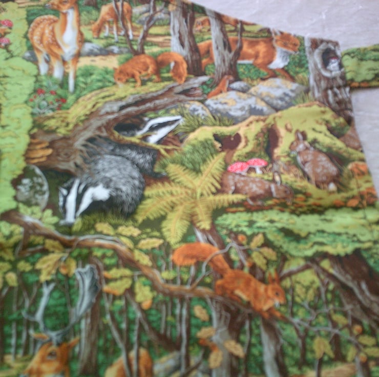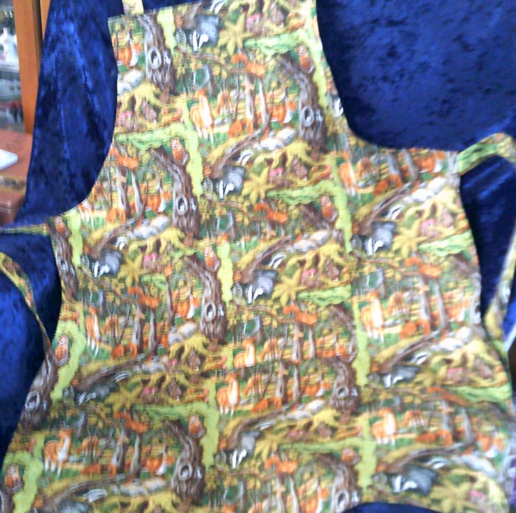 The design of the fabric used for this apron is of a woodland with badgers, deer, squirrels and owls.