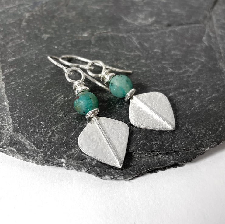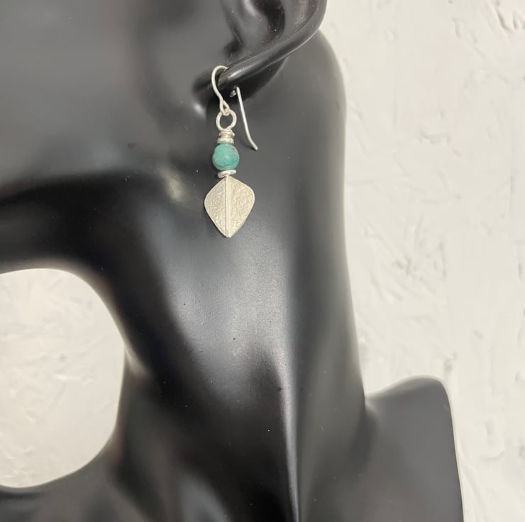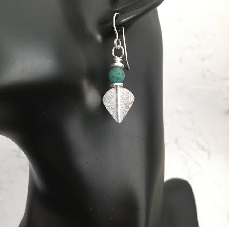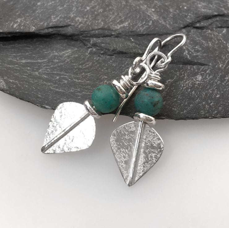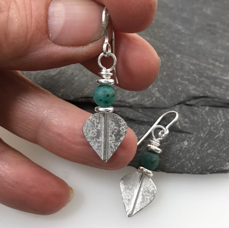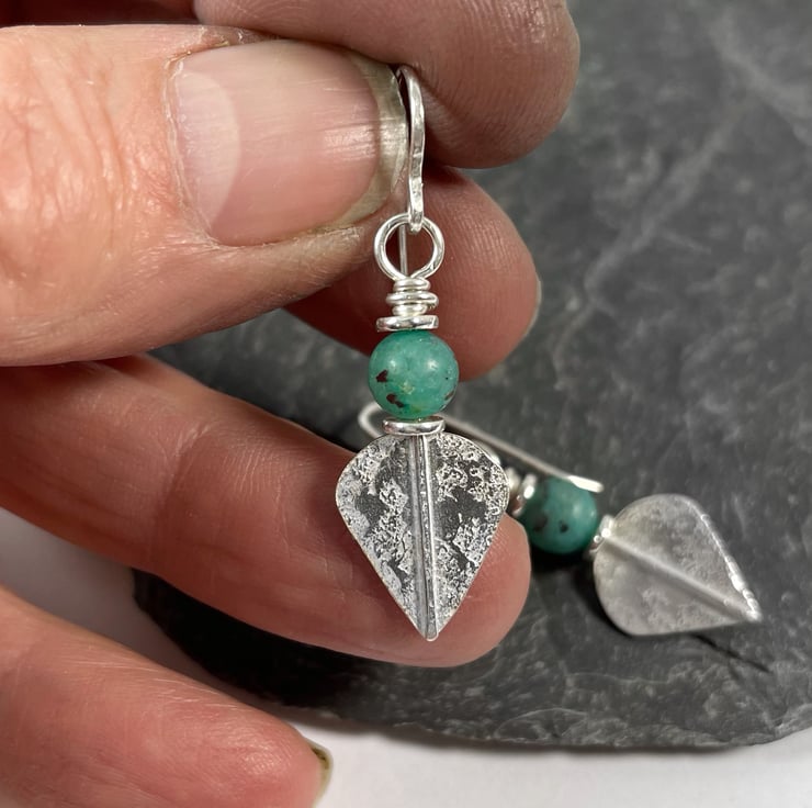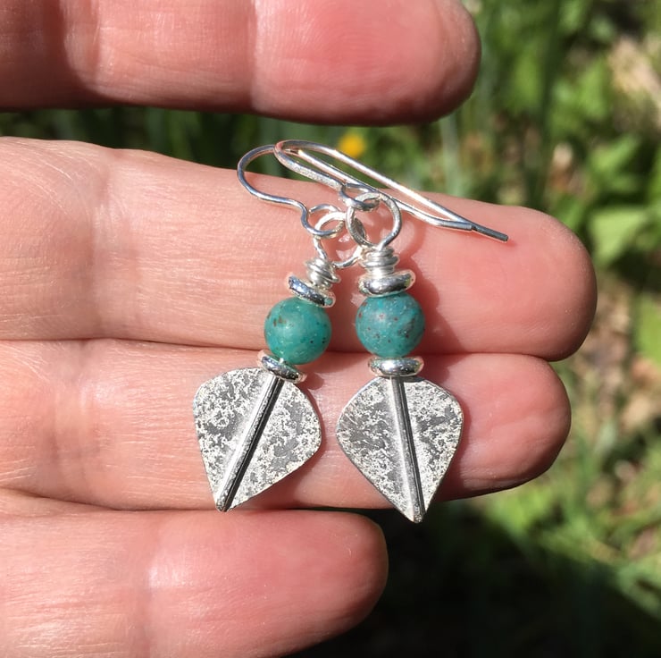 Small lightweight sterling silver teal cupric chrysocolla leaf spear earrings.