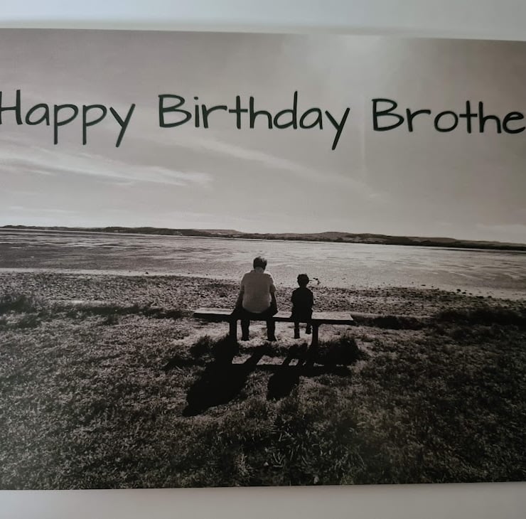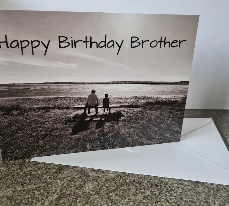 Card with black and white print. The picture is of my sons taking in the view on a walk along the Exe Estuary Trail during a visit to Exmouth in Devon in 2021.