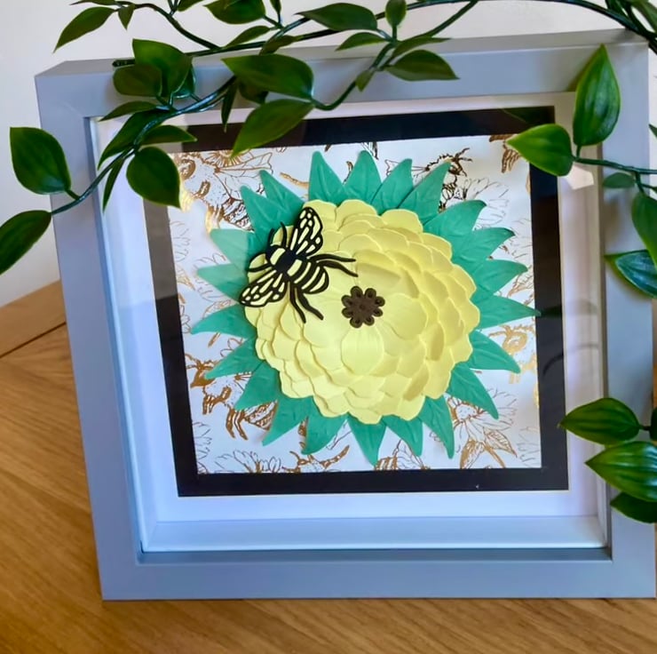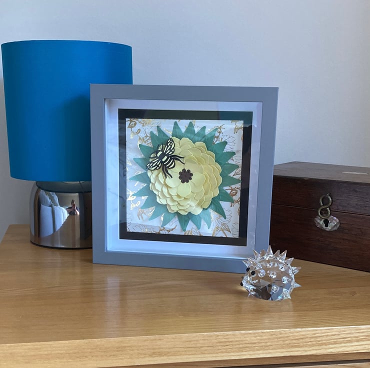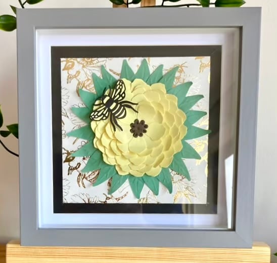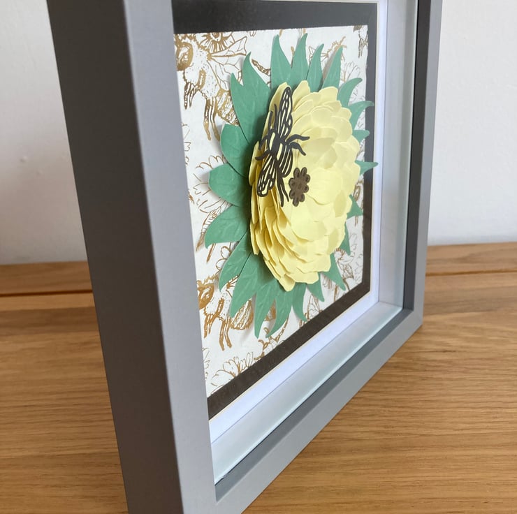 A beautiful handcrafted papercut picture featuring a large yellow sunflower with a raised bee detail.